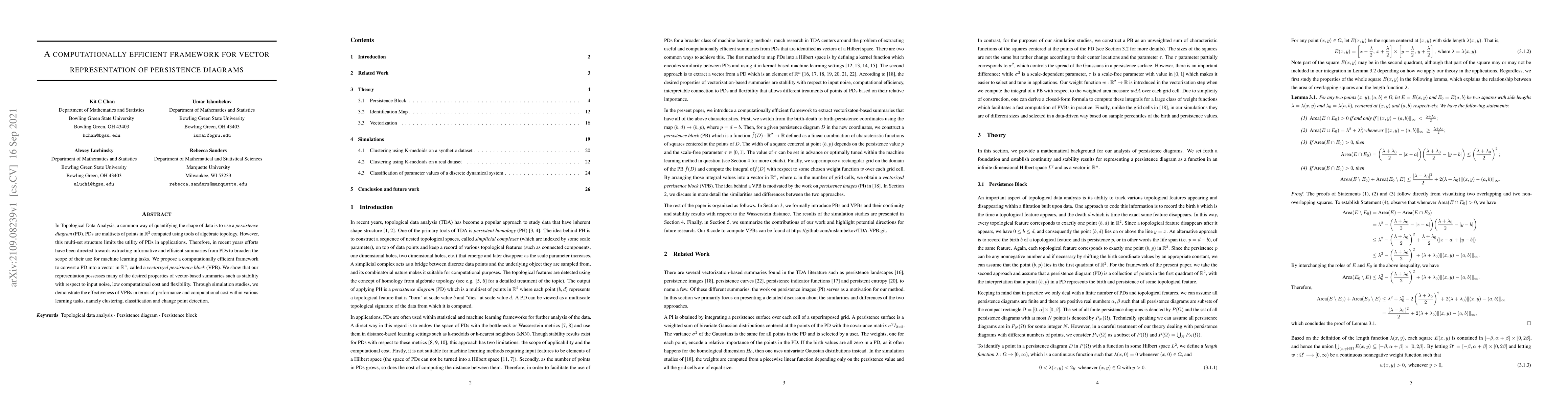 In Topological Data Analysis, a common way of quantifying the shape of data is to use a persistence diagram (PD). PDs are multisets of points in $\mathbb{R}^2$ computed using tools of algebraic topology. However, this multi-set structure limits the utility of PDs in applications. Therefore, in recent years efforts have been directed towards extracting informative and efficient summaries from PDs to broaden the scope of their use for machine learning tasks. We propose a computationally efficient framework to convert a PD into a vector in $\mathbb{R}^n$, called a vectorized persistence block (VPB). We show that our representation possesses many of the desired properties of vector-based summaries such as stability with respect to input noise, low computational cost and flexibility. Through simulation studies, we demonstrate the effectiveness of VPBs in terms of performance and computational cost within various learning tasks, namely clustering, classification and change point detection.