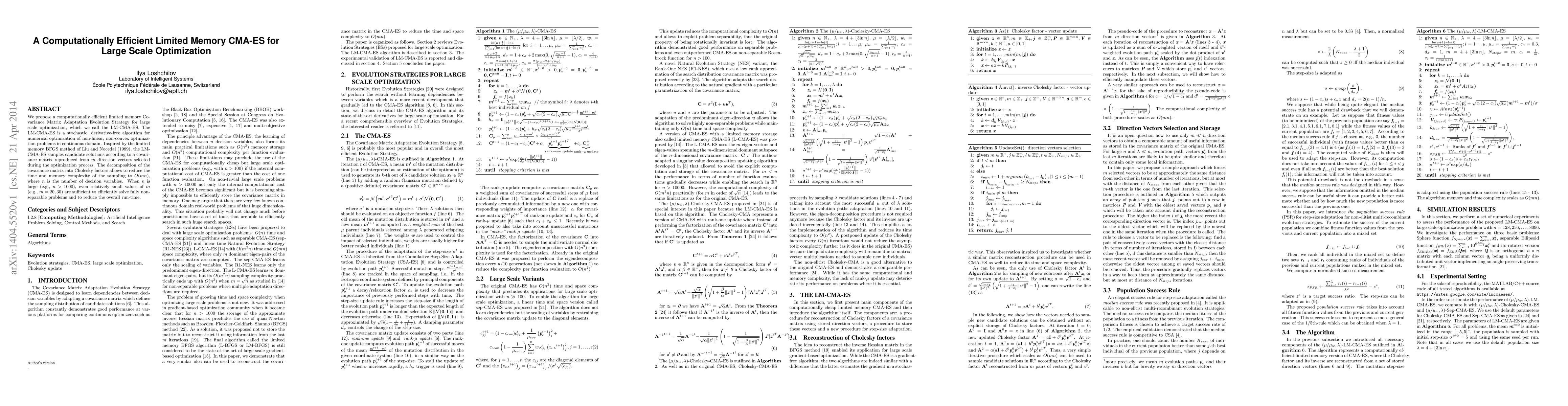 This paper introduces a computationally efficient limited memory Covariance Matrix Adaptation Evolution Strategy (LM-CMA-ES) for large-scale optimization. The LM-CMA-ES leverages a reduced memory approach inspired by limited memory BFGS, efficiently solving non-linear, non-convex problems with $O(mn)$ complexity, where $m$ is small even for large $n$ (e.g., $n > 1000$).