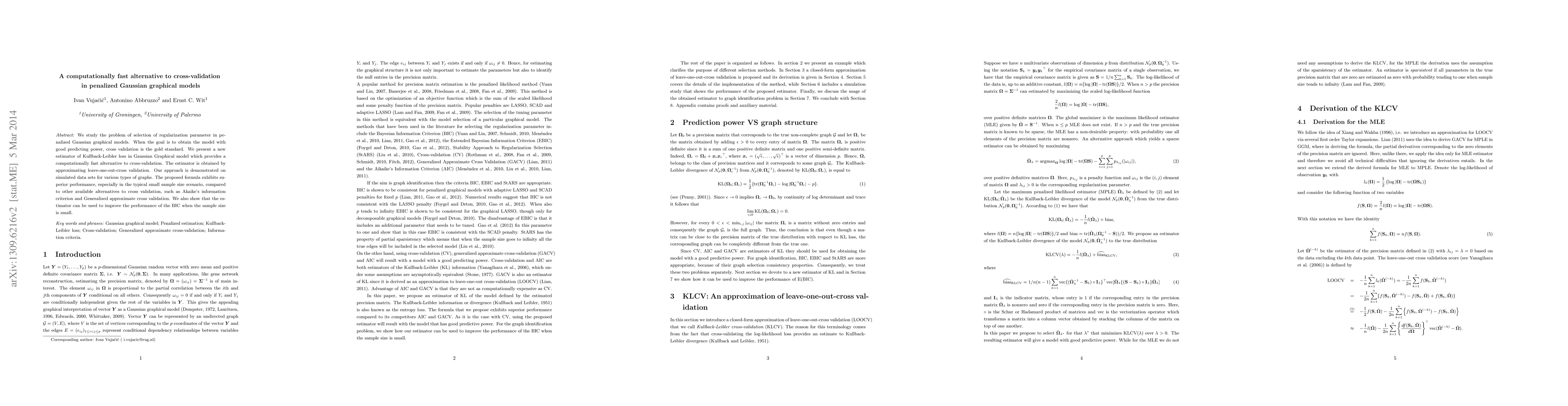 This paper proposes a computationally efficient alternative to cross-validation for selecting the regularization parameter in penalized Gaussian graphical models, using a new estimator of Kullback-Leibler loss. The method demonstrates superior performance, especially in small sample sizes, compared to alternatives like Akaike's information criterion and Generalized approximate cross-validation.