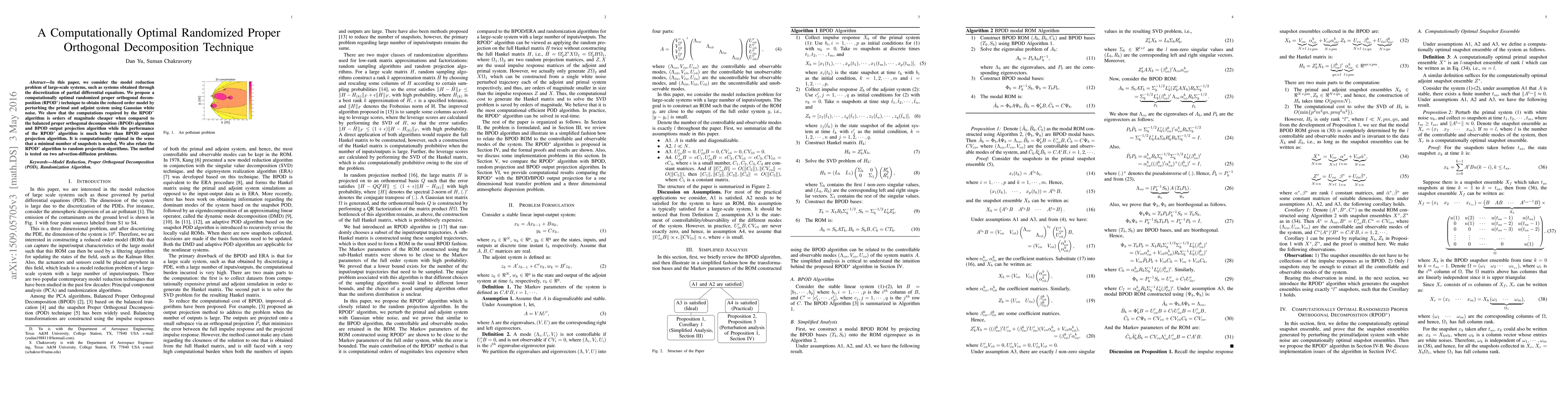 In this paper, we consider the model reduction problem of large-scale systems, such as systems obtained through the discretization of partial differential equations. We propose a computationally optimal randomized proper orthogonal decomposition (RPOD*) technique to obtain the reduced order model by perturbing the primal and adjoint system using Gaussian white noise. We show that the computations required by the RPOD* algorithm is orders of magnitude cheaper when compared to the balanced proper orthogonal decomposition (BPOD) algorithm and BPOD output projection algorithm while the performance of the RPOD* algorithm is much better than BPOD output projection algorithm. It is optimal in the sense that a minimal number of snapshots is needed. We also relate the RPOD* algorithm to random projection algorithms. The method is tested on two advection-diffusion equations.