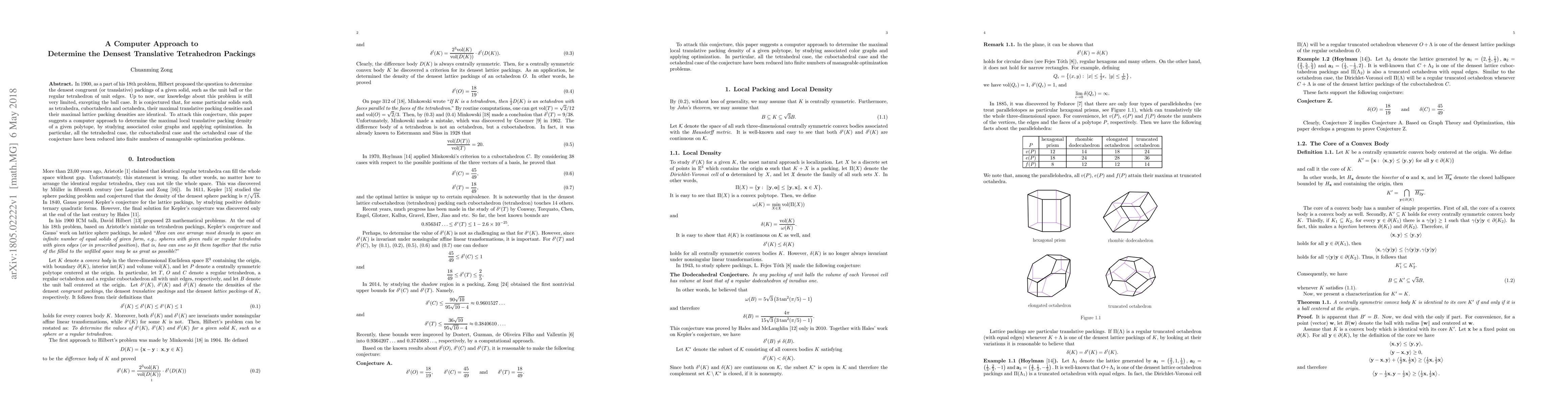 This paper proposes a computer-based method to determine the densest translative packings of regular tetrahedrons, cuboctahedra, and octahedra. It uses optimization techniques and color graphs to reduce the conjecture into manageable computational problems.