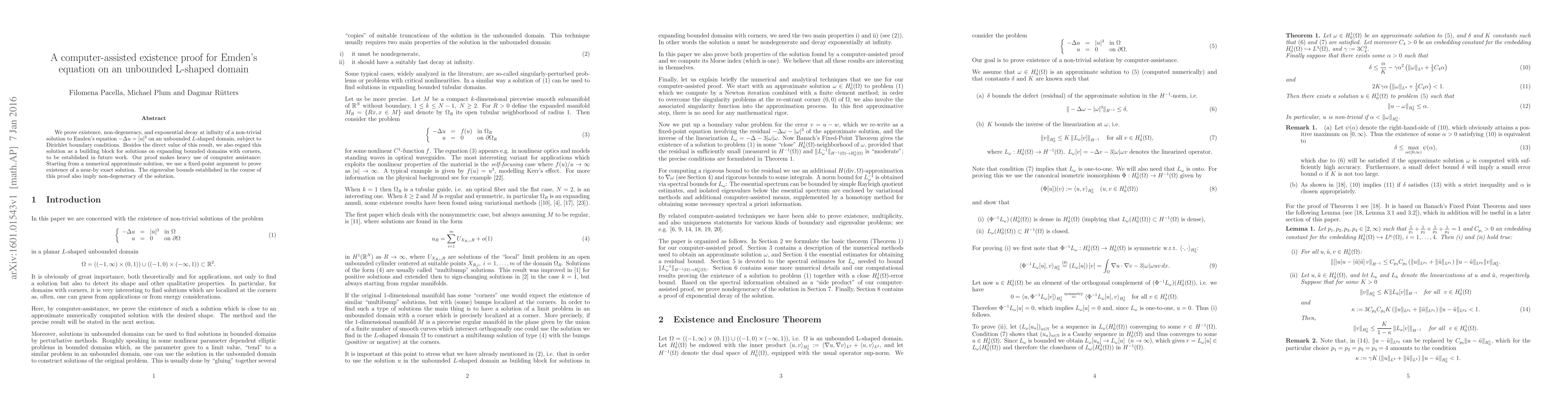 We prove existence, non-degeneracy, and exponential decay at infinity of a non-trivial solution to Emden's equation $-\Delta u = | u |^3$ on an unbounded $L$-shaped domain, subject to Dirichlet boundary conditions. Besides the direct value of this result, we also regard this solution as a building block for solutions on expanding bounded domains with corners, to be established in future work. Our proof makes heavy use of computer assistance: Starting from a numerical approximate solution, we use a fixed-point argument to prove existence of a near-by exact solution. The eigenvalue bounds established in the course of this proof also imply non-degeneracy of the solution.