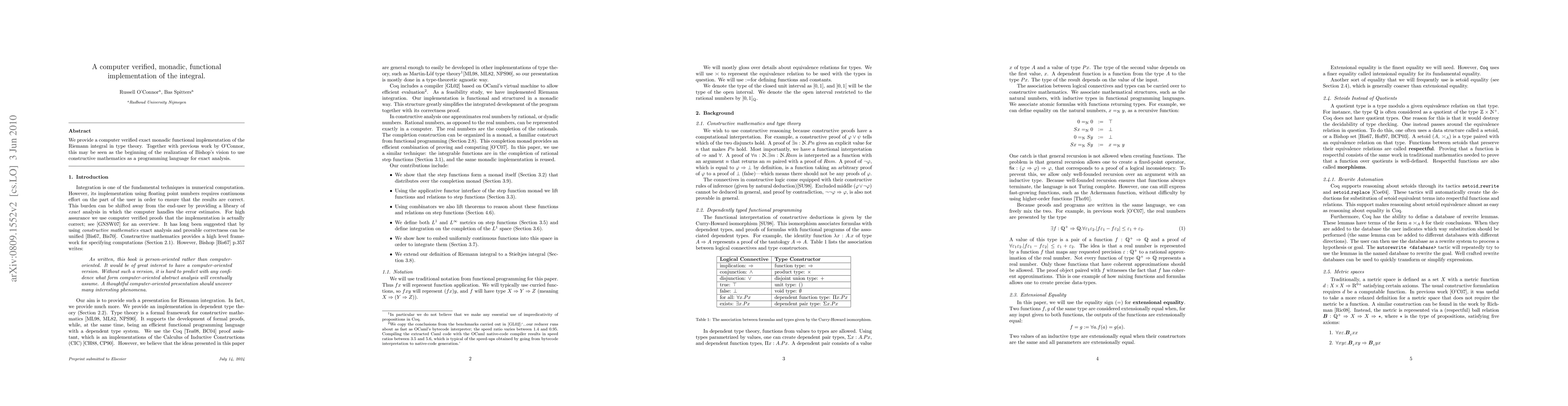 This research presents a computer-verified, precise implementation of the mathematical integral using functional programming within type theory. It marks a step toward using constructive mathematics as a reliable foundation for exact computational analysis.