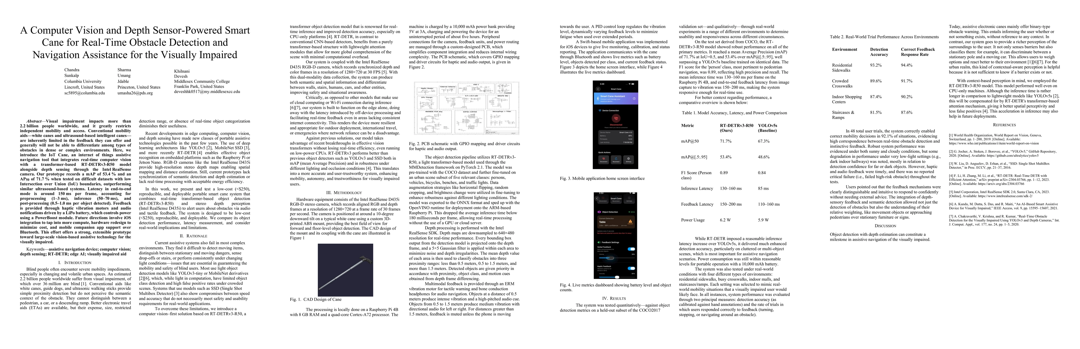 Visual impairment impacts more than 2.2 billion people worldwide, and it greatly restricts independent mobility and access. Conventional mobility aids - white canes and ultrasound-based intelligent canes - are inherently limited in the feedback they can offer and generally will not be able to differentiate among types of obstacles in dense or complex environments. Here, we introduce the IoT Cane, an internet of things assistive navigation tool that integrates real-time computer vision with a transformer-based RT-DETRv3-R50 model alongside depth sensing through the Intel RealSense camera. Our prototype records a mAP of 53.4% and an AP50 of 71.7% when tested on difficult datasets with low Intersection over Union (IoU) boundaries, outperforming similar ultrasound-based systems. Latency in end-to-end mode is around 150 ms per frame, accounting for preprocessing (1-3 ms), inference (50-70 ms), and post-processing (0.5-1.0 ms per object detected). Feedback is provided through haptic vibration motors and audio notifications driven by a LiPo battery, which controls power using a PowerBoost module. Future directions involve iOS integration to tap into more compute, hardware redesign to minimize cost, and mobile companion app support over Bluetooth. This effort offers a strong, extensible prototype toward large-scale vision-based assistive technology for the visually impaired.