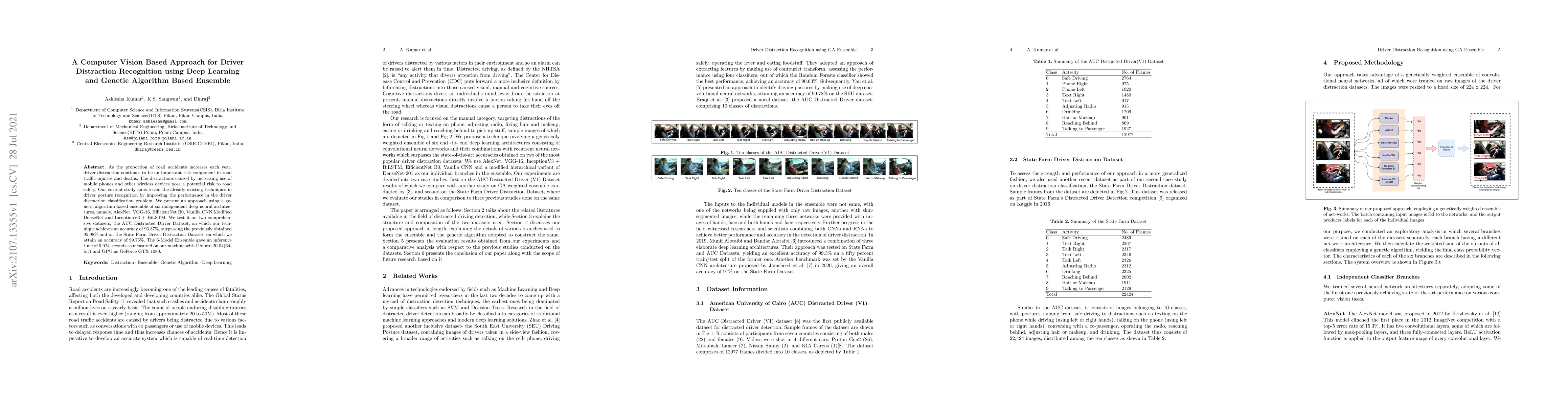 This paper proposes a computer vision-based method for recognizing driver distraction using a genetic algorithm-based ensemble of six deep learning models. The approach achieves high accuracy on two datasets, outperforming previous techniques and demonstrating a fast inference time of 0.024 seconds.