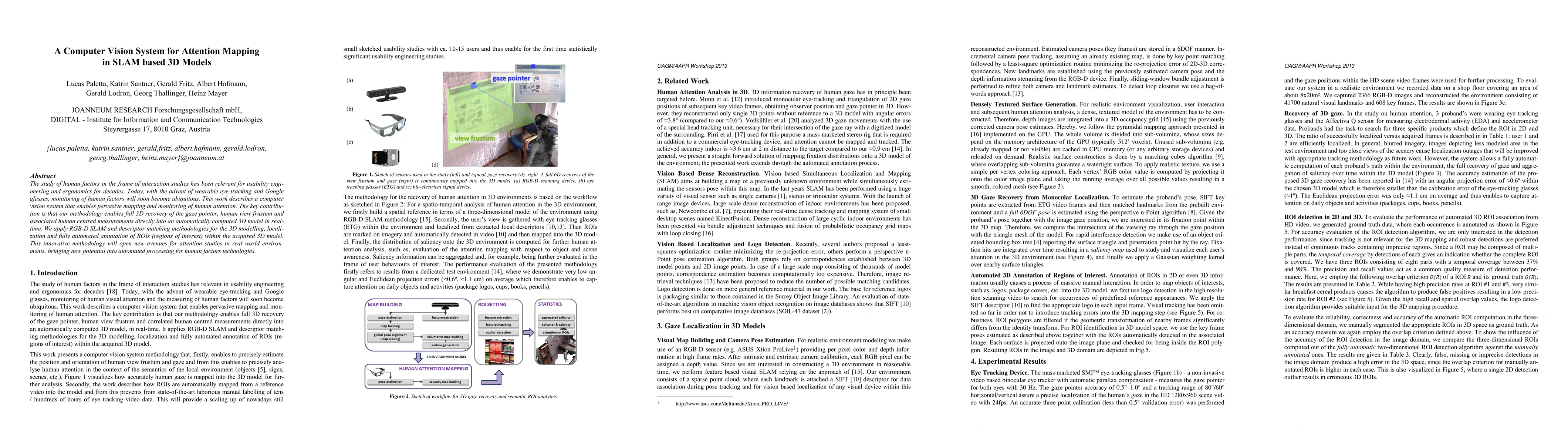 The study of human factors in the frame of interaction studies has been relevant for usability engi-neering and ergonomics for decades. Today, with the advent of wearable eye-tracking and Google glasses, monitoring of human factors will soon become ubiquitous. This work describes a computer vision system that enables pervasive mapping and monitoring of human attention. The key contribu-tion is that our methodology enables full 3D recovery of the gaze pointer, human view frustum and associated human centred measurements directly into an automatically computed 3D model in real-time. We apply RGB-D SLAM and descriptor matching methodologies for the 3D modelling, locali-zation and fully automated annotation of ROIs (regions of interest) within the acquired 3D model. This innovative methodology will open new avenues for attention studies in real world environments, bringing new potential into automated processing for human factors technologies.