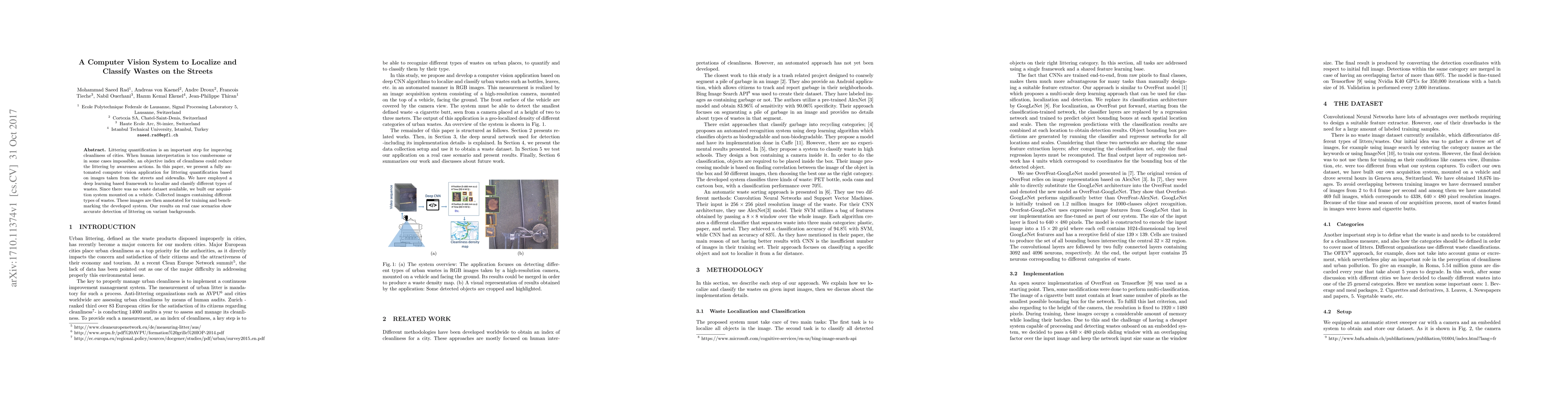 Littering quantification is an important step for improving cleanliness of cities. When human interpretation is too cumbersome or in some cases impossible, an objective index of cleanliness could reduce the littering by awareness actions. In this paper, we present a fully automated computer vision application for littering quantification based on images taken from the streets and sidewalks. We have employed a deep learning based framework to localize and classify different types of wastes. Since there was no waste dataset available, we built our acquisition system mounted on a vehicle. Collected images containing different types of wastes. These images are then annotated for training and benchmarking the developed system. Our results on real case scenarios show accurate detection of littering on variant backgrounds.