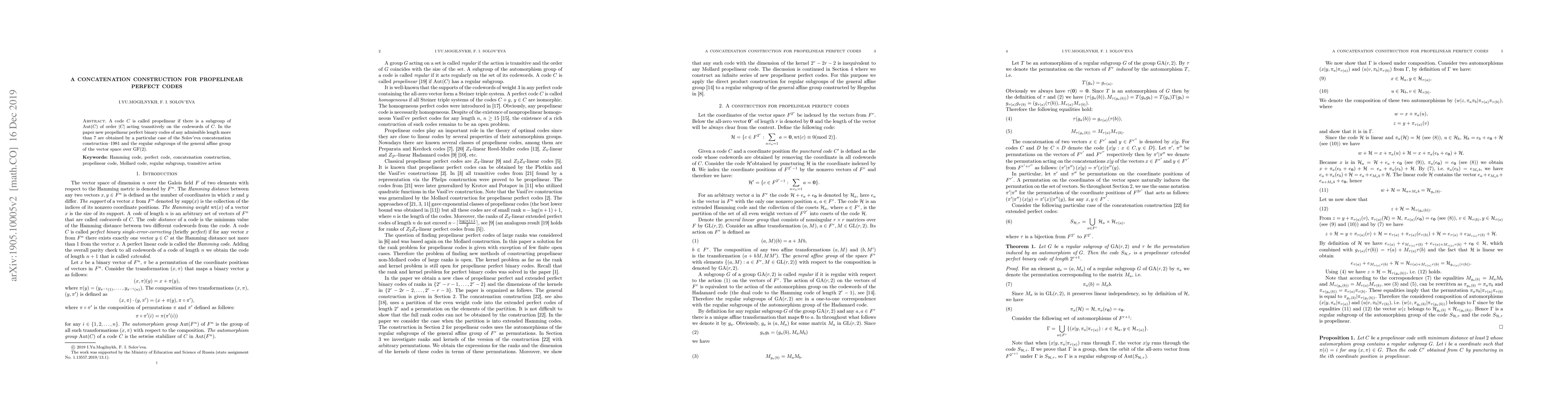 This paper constructs new propelinear perfect binary codes using a concatenation method based on regular subgroups of the general affine group over GF(2), extending the Solov'eva construction to lengths greater than 7.