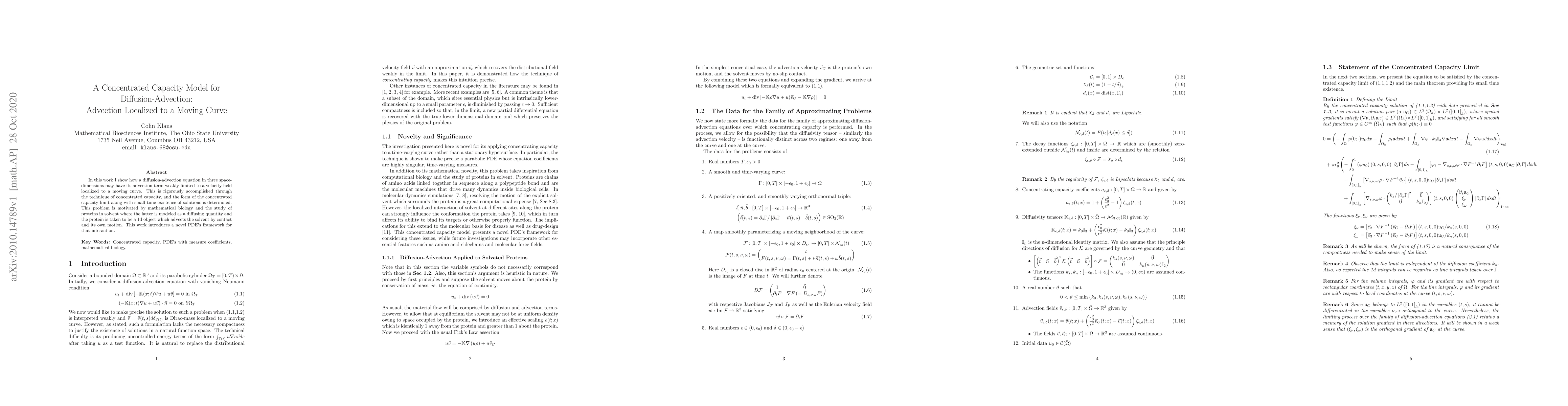 In this work I show how a diffusion-advection equation in three space-dimensions may have its advection term weakly limited to a velocity field localized to a moving curve. This is rigorously accomplished through the technique of concentrated capacity, and the form of the concentrated capacity limit along with small time existence of solutions is determined. This problem is motivated by mathematical biology and the study of proteins in solvent where the latter is modeled as a diffusing quantity and the protein is taken to be a 1d object which advects the solvent by contact and its own motion. This work introduces a novel PDE's framework for that interaction.
