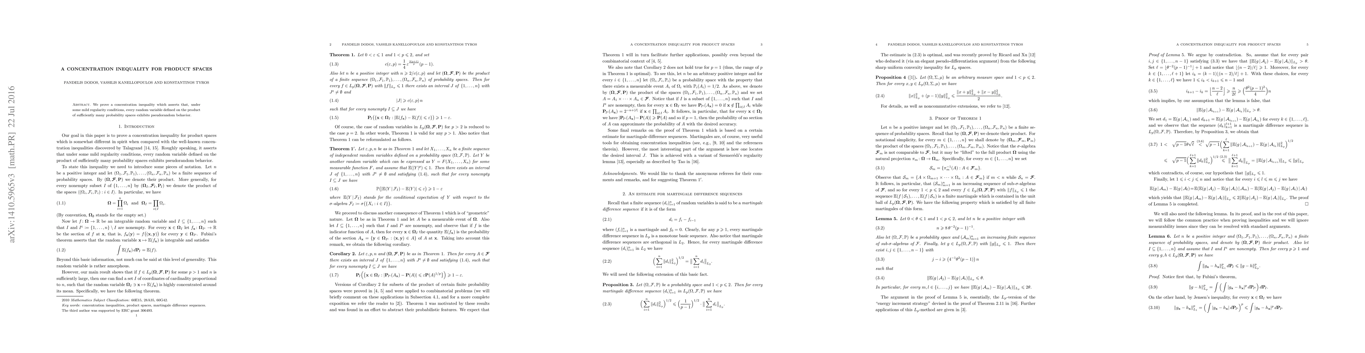 This research establishes a concentration inequality, proving that under certain conditions, random variables across multiple probability spaces behave pseudorandomly, implying a form of regularity and predictability in complex, high-dimensional probability spaces.