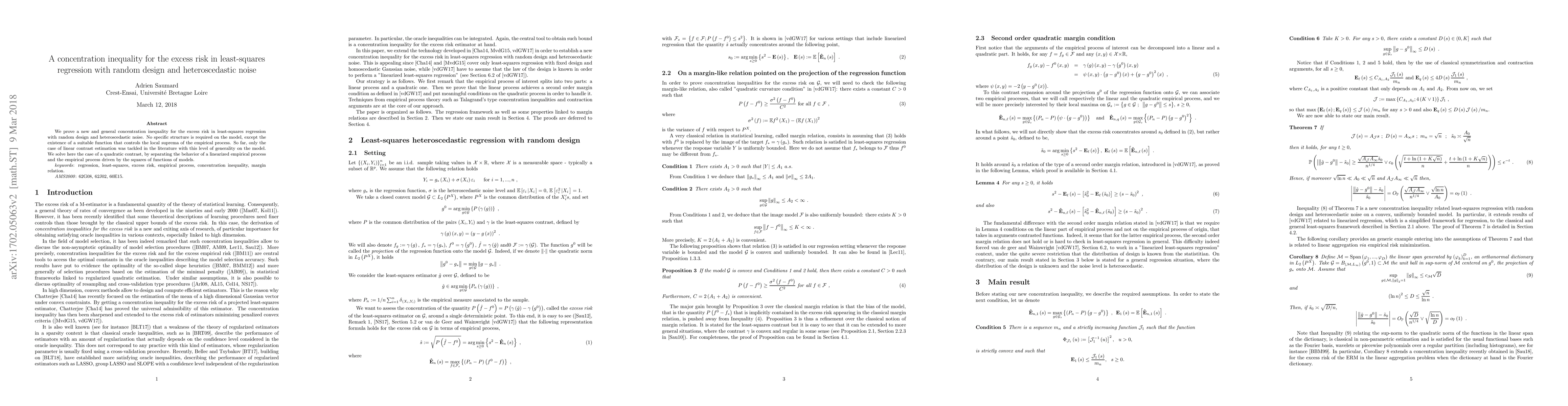 This paper establishes a new concentration inequality for the excess risk in least-squares regression under random design and heteroscedastic noise, without requiring specific model structures beyond the existence of a control function for empirical processes. It extends the results to quadratic contrasts, differentiating between linearized and squared empirical processes.