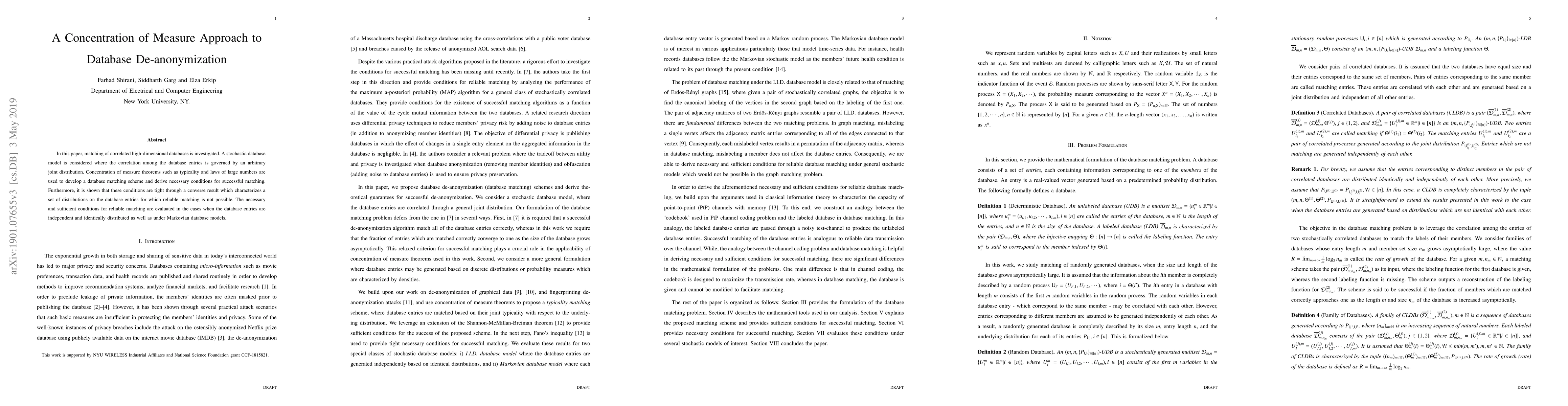 This paper uses concentration of measure theorems to develop a database matching scheme for correlated high-dimensional databases, deriving necessary conditions for successful matching and showing these conditions are tight through a converse result. The study evaluates the conditions under both independent and Markovian database models.