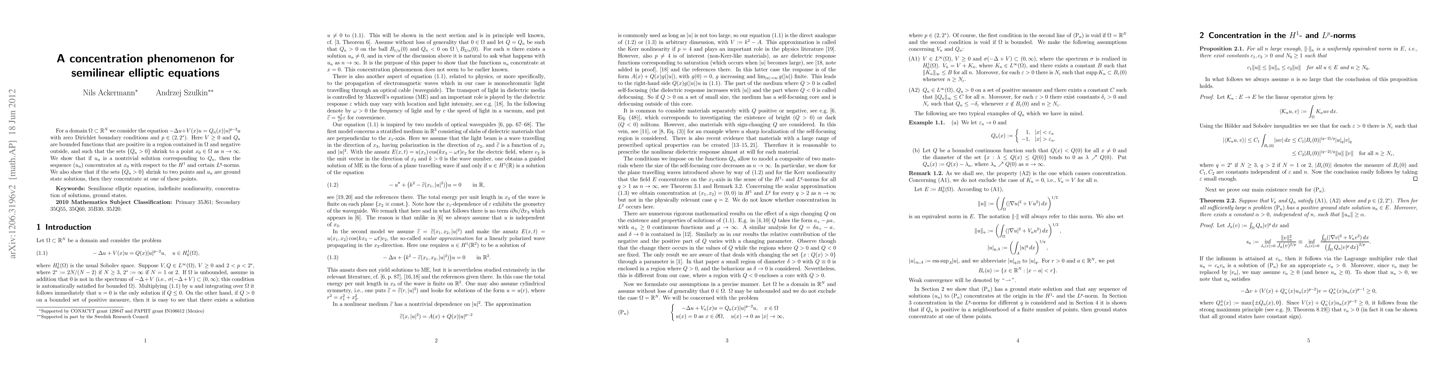 For a domain $\Omega\subset\dR^N$ we consider the equation $ -\Delta u + V(x)u = Q_n(x)\abs{u}^{p-2}u$ with zero Dirichlet boundary conditions and $p\in(2,2^*)$. Here $V\ge 0$ and $Q_n$ are bounded functions that are positive in a region contained in $\Omega$ and negative outside, and such that the sets $\{Q_n>0\}$ shrink to a point $x_0\in\Omega$ as $n\to\infty$. We show that if $u_n$ is a nontrivial solution corresponding to $Q_n$, then the sequence $(u_n)$ concentrates at $x_0$ with respect to the $H^1$ and certain $L^q$-norms. We also show that if the sets $\{Q_n>0\}$ shrink to two points and $u_n$ are ground state solutions, then they concentrate at one of these points.