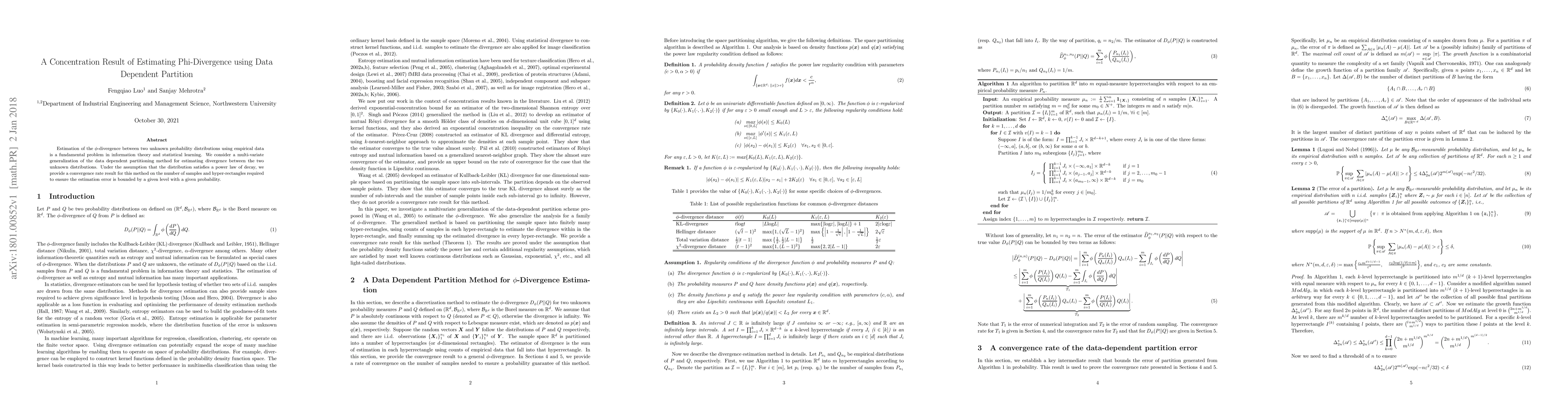 Estimation of the $\phi$-divergence between two unknown probability distributions using empirical data is a fundamental problem in information theory and statistical learning. We consider a multi-variate generalization of the data dependent partitioning method for estimating divergence between the two unknown distributions. Under the assumption that the distribution satisfies a power law of decay, we provide a convergence rate result for this method on the number of samples and hyper-rectangles required to ensure the estimation error is bounded by a given level with a given probability.