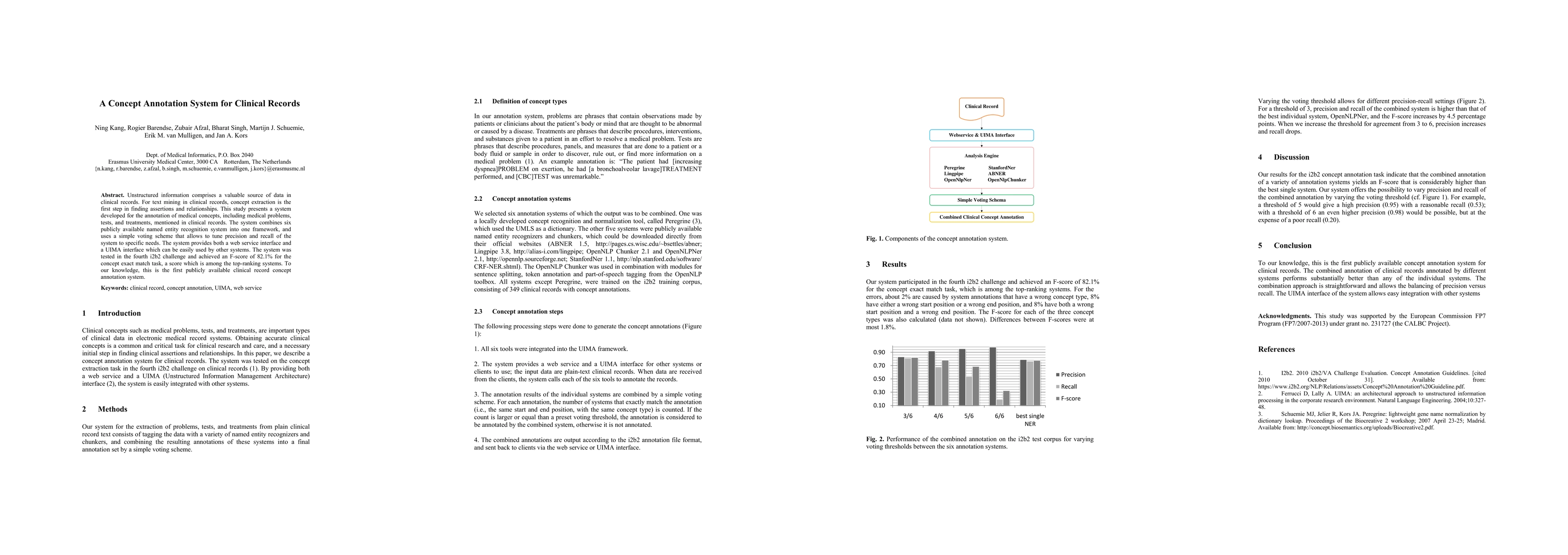 Unstructured information comprises a valuable source of data in clinical records. For text mining in clinical records, concept extraction is the first step in finding assertions and relationships. This study presents a system developed for the annotation of medical concepts, including medical problems, tests, and treatments, mentioned in clinical records. The system combines six publicly available named entity recognition system into one framework, and uses a simple voting scheme that allows to tune precision and recall of the system to specific needs. The system provides both a web service interface and a UIMA interface which can be easily used by other systems. The system was tested in the fourth i2b2 challenge and achieved an F-score of 82.1% for the concept exact match task, a score which is among the top-ranking systems. To our knowledge, this is the first publicly available clinical record concept annotation system.
