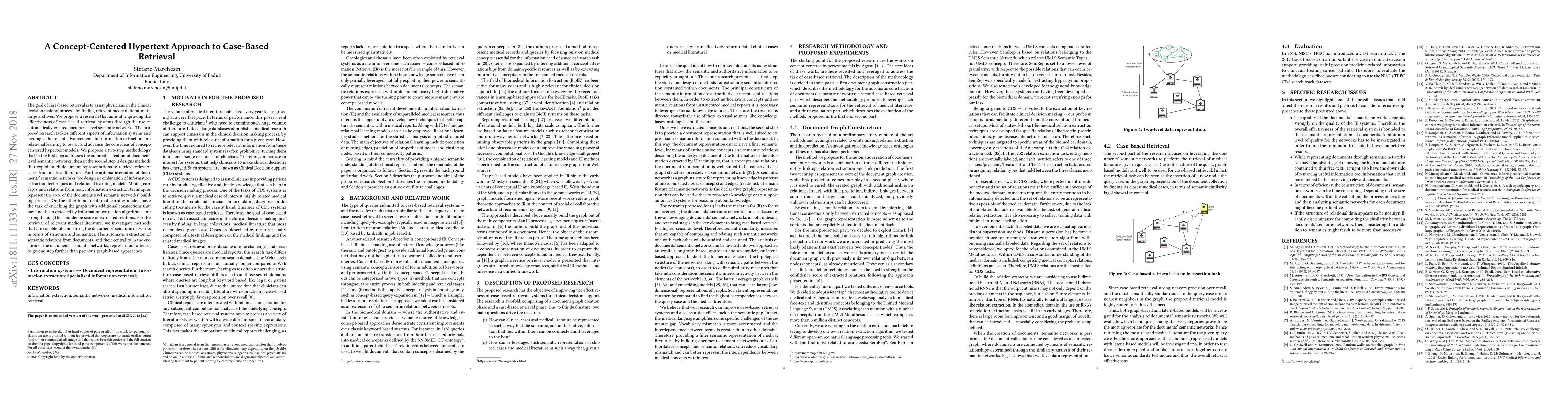 This paper proposes a concept-centered hypertext approach to improve case-based retrieval systems for medical literature, using automatically created document-level semantic networks. It employs a combination of information extraction and relational learning to enhance the retrieval of relevant clinical cases.