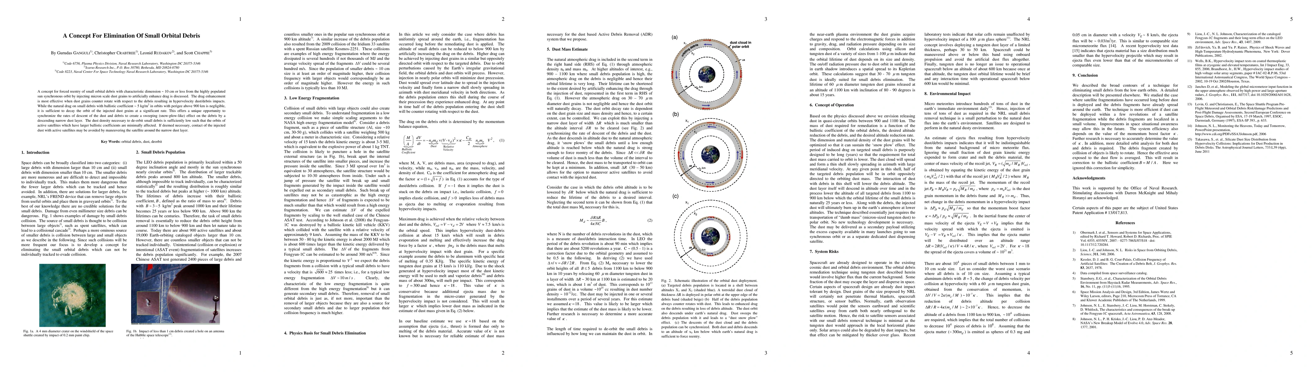 This paper proposes a method for eliminating small orbital debris (~10 cm) by injecting micron-scale dust grains to enhance drag, causing forced reentry. The dust grains counter-rotate with the debris to create hypervelocity impacts, effectively sweeping the debris down.