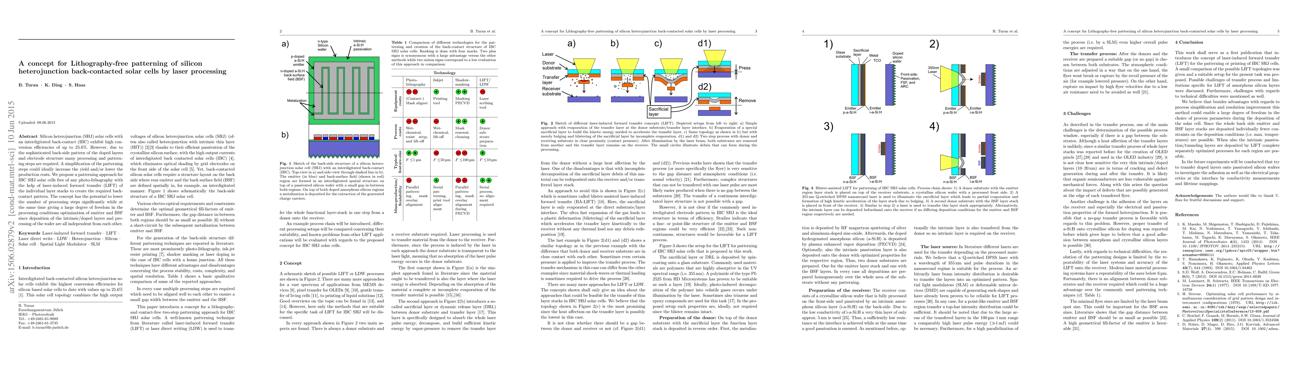 This paper proposes a lithography-free method using laser-induced forward transfer (LIFT) to pattern silicon heterojunction solar cells, aiming to simplify the manufacturing process and reduce costs by eliminating photo-lithography steps. The method allows for independent optimization of intrinsic and doped layers, potentially increasing yield and efficiency.
