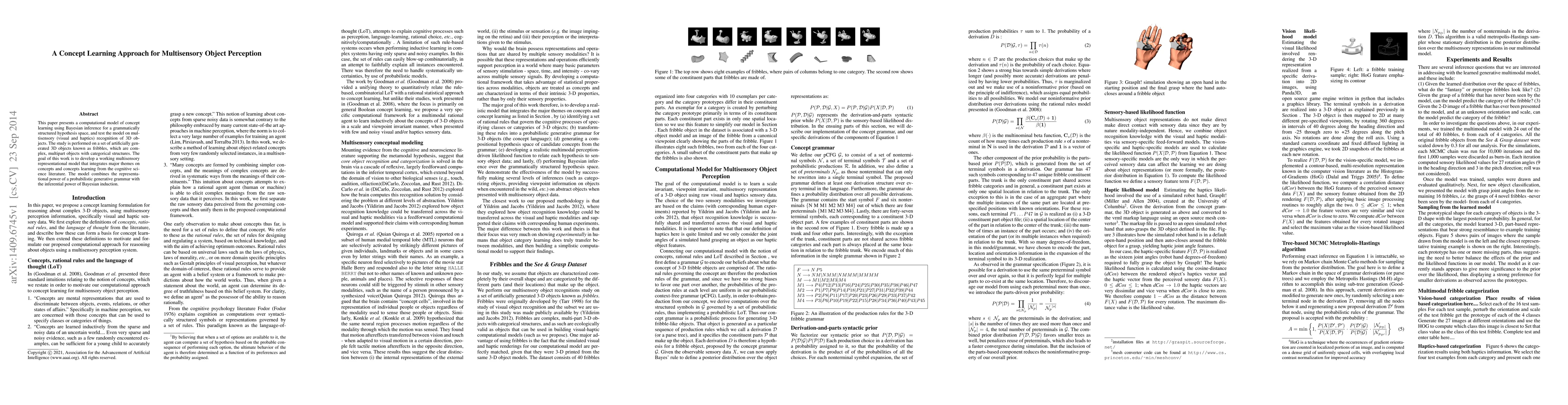 This paper proposes a computational model for learning concepts through Bayesian inference applied to a structured hypothesis space, and tests it on multisensory recognition of complex 3D objects called fribbles. The model integrates probabilistic generative grammar and Bayesian induction to develop a multisensory representation.