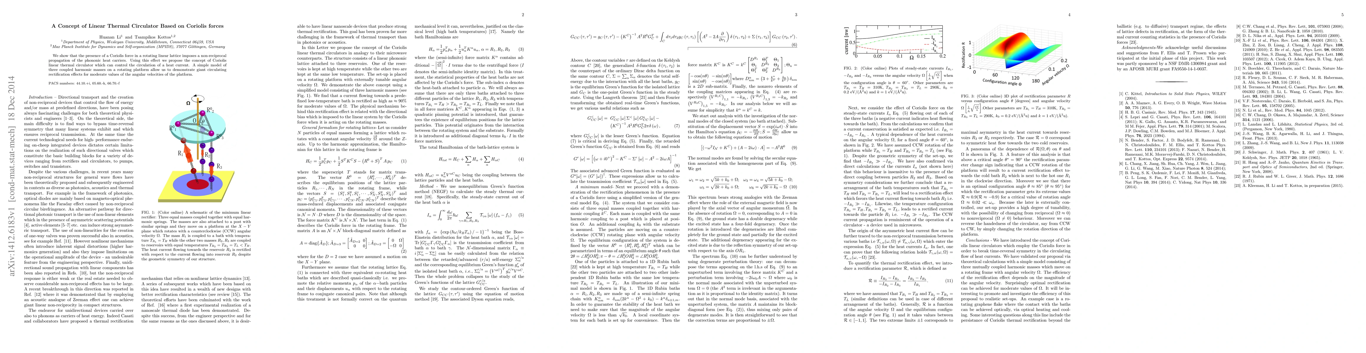 Researchers propose a concept for a Coriolis-based linear thermal circulator that controls heat circulation using non-reciprocal phononic heat carrier propagation. They demonstrate giant circulating rectification effects at moderate platform angular velocities.