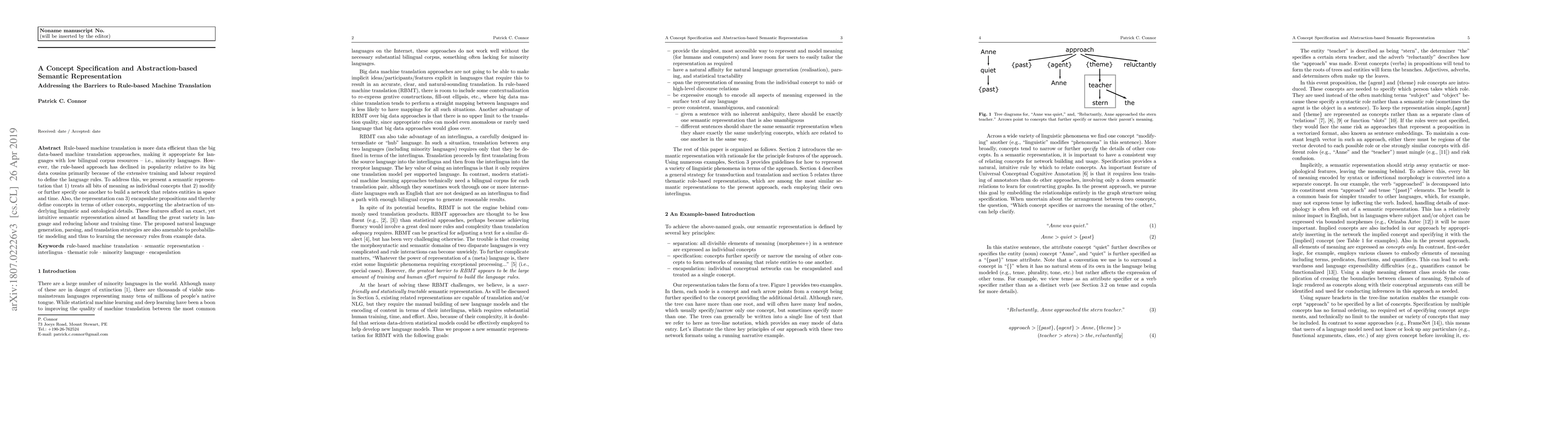 Rule-based machine translation is more data efficient than the big data-based machine translation approaches, making it appropriate for languages with low bilingual corpus resources -- i.e., minority languages. However, the rule-based approach has declined in popularity relative to its big data cousins primarily because of the extensive training and labour required to define the language rules. To address this, we present a semantic representation that 1) treats all bits of meaning as individual concepts that 2) modify or further specify one another to build a network that relates entities in space and time. Also, the representation can 3) encapsulate propositions and thereby define concepts in terms of other concepts, supporting the abstraction of underlying linguistic and ontological details. These features afford an exact, yet intuitive semantic representation aimed at handling the great variety in language and reducing labour and training time. The proposed natural language generation, parsing, and translation strategies are also amenable to probabilistic modeling and thus to learning the necessary rules from example data.