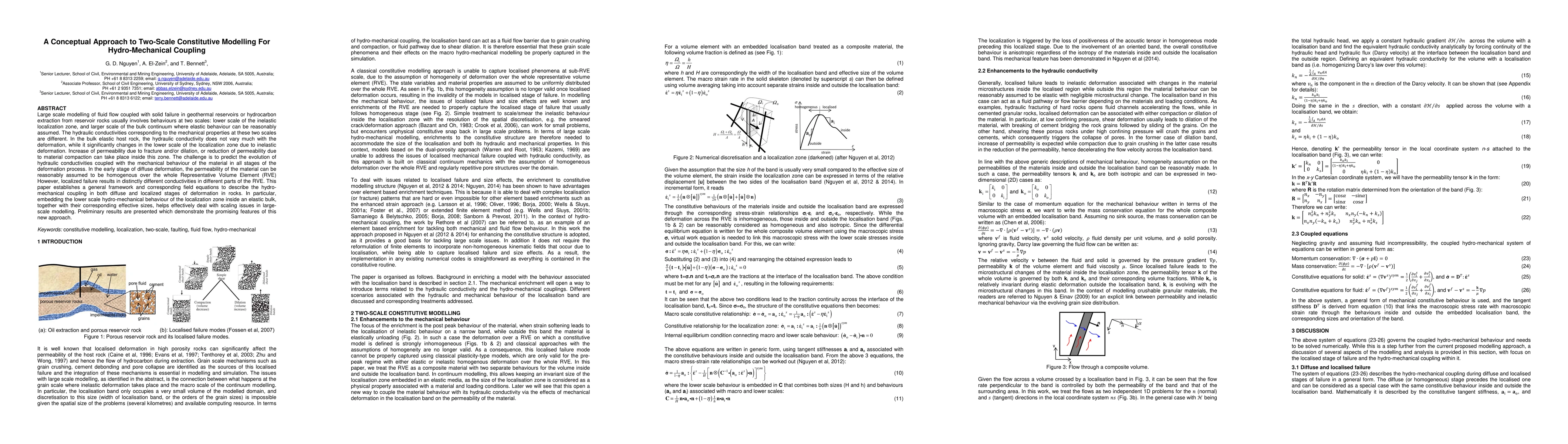 Large scale modelling of fluid flow coupled with solid failure in geothermal reservoirs or hydrocarbon extraction from reservoir rocks usually involves behaviours at two scales: lower scale of the inelastic localization zone, and larger scale of the bulk continuum where elastic behaviour can be reasonably assumed. The hydraulic conductivities corresponding to the mechanical properties at these two scales are different. In the bulk elastic host rock, the hydraulic conductivity does not vary much with the deformation, while it significantly changes in the lower scale of the localization zone due to inelastic deformation. Increase of permeability due to fracture and/or dilation, or reduction of permeability due to material compaction can take place inside this zone. The challenge is to predict the evolution of hydraulic conductivities coupled with the mechanical behaviour of the material in all stages of the deformation process. In the early stage of diffuse deformation, the permeability of the material can be reasonably assumed to be homogenous over the whole Representative Volume Element (RVE) However, localized failure results in distinctly different conductivities in different parts of the RVE. This paper establishes a general framework and corresponding field equations to describe the hydro-mechanical coupling in both diffuse and localized stages of deformation in rocks. In particular, embedding the lower scale hydro-mechanical behaviour of the localization zone inside an elastic bulk, together with their corresponding effective sizes, helps effectively deal with scaling issues in large-scale modelling. Preliminary results are presented which demonstrate the promising features of this new approach.