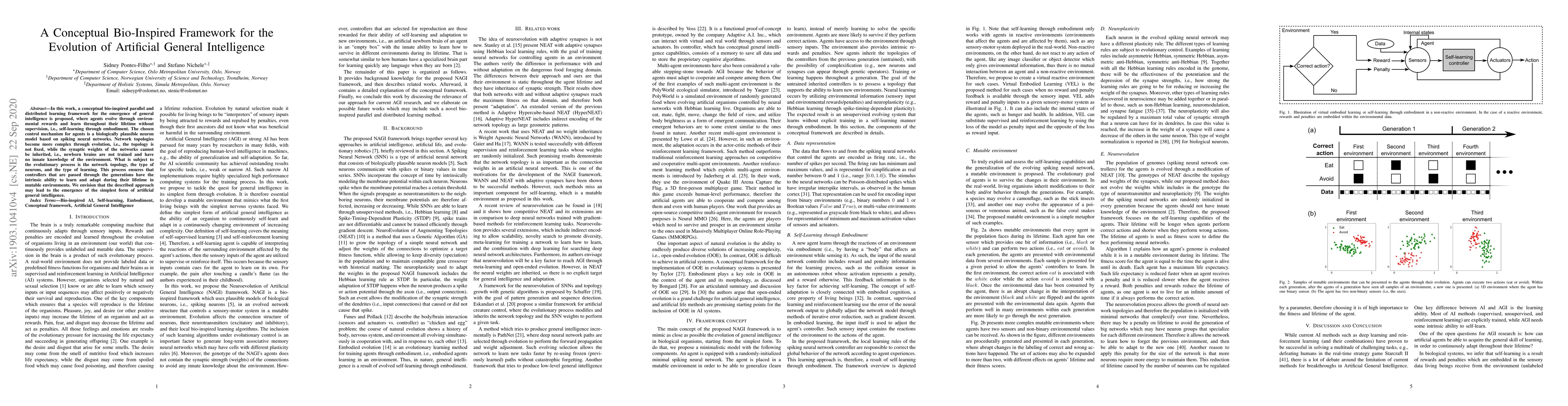 In this work, a conceptual bio-inspired parallel and distributed learning framework for the emergence of general intelligence is proposed, where agents evolve through environmental rewards and learn throughout their lifetime without supervision, i.e., self-learning through embodiment. The chosen control mechanism for agents is a biologically plausible neuron model based on spiking neural networks. Network topologies become more complex through evolution, i.e., the topology is not fixed, while the synaptic weights of the networks cannot be inherited, i.e., newborn brains are not trained and have no innate knowledge of the environment. What is subject to the evolutionary process is the network topology, the type of neurons, and the type of learning. This process ensures that controllers that are passed through the generations have the intrinsic ability to learn and adapt during their lifetime in mutable environments. We envision that the described approach may lead to the emergence of the simplest form of artificial general intelligence.