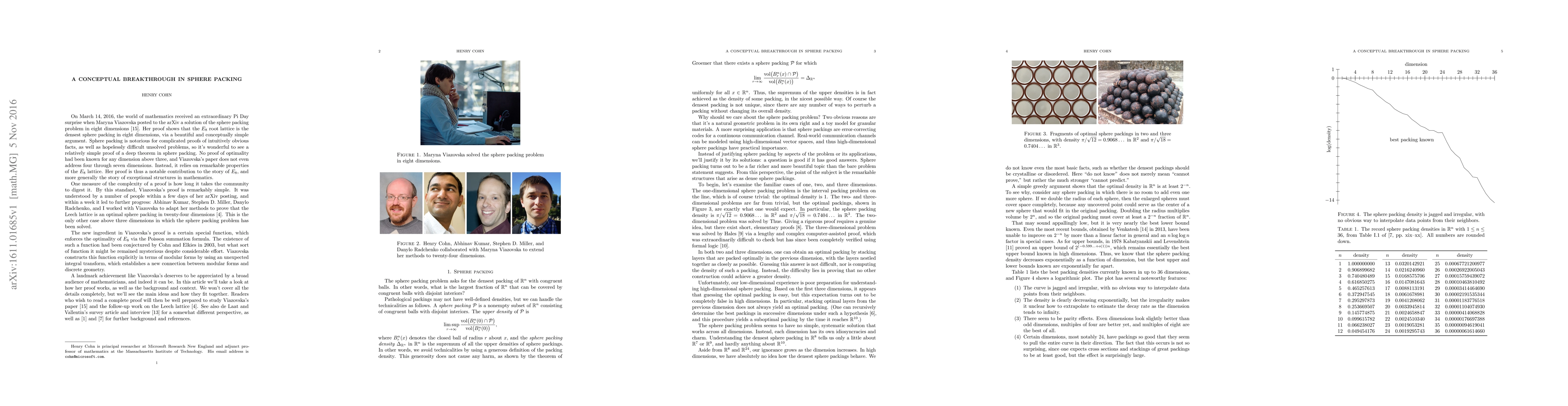 This expository paper describes Viazovska's breakthrough solution of the sphere packing problem in eight dimensions, as well as its extension to twenty-four dimensions by Cohn, Kumar, Miller, Radchenko, and Viazovska.