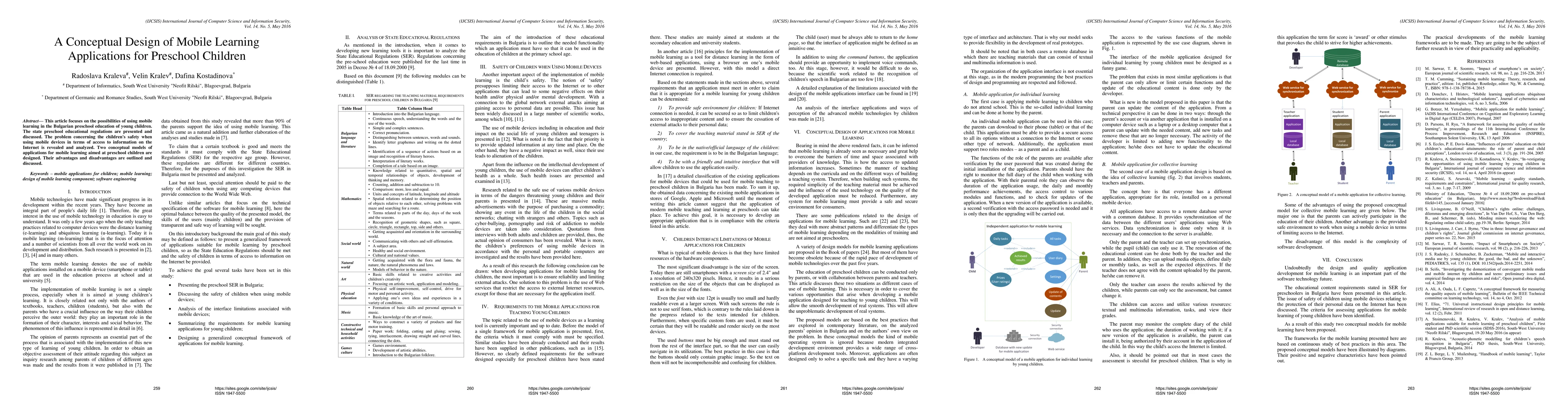 This paper explores the potential of mobile learning applications in Bulgarian preschool education, addressing safety concerns regarding internet access, and proposes two conceptual models for mobile learning apps, discussing their respective benefits and drawbacks. Keywords include mobile applications for children, mobile learning, and software engineering.