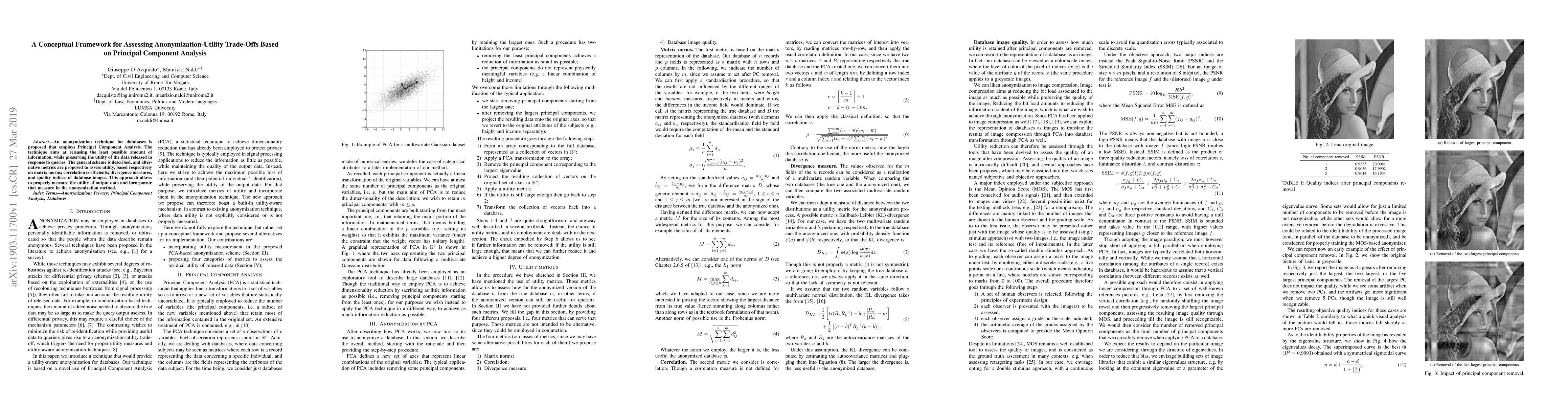 An anonymization technique for databases is proposed that employs Principal Component Analysis. The technique aims at releasing the least possible amount of information, while preserving the utility of the data released in response to queries. The general scheme is described, and alternative metrics are proposed to assess utility, based respectively on matrix norms; correlation coefficients; divergence measures, and quality indices of database images. This approach allows to properly measure the utility of output data and incorporate that measure in the anonymization method.