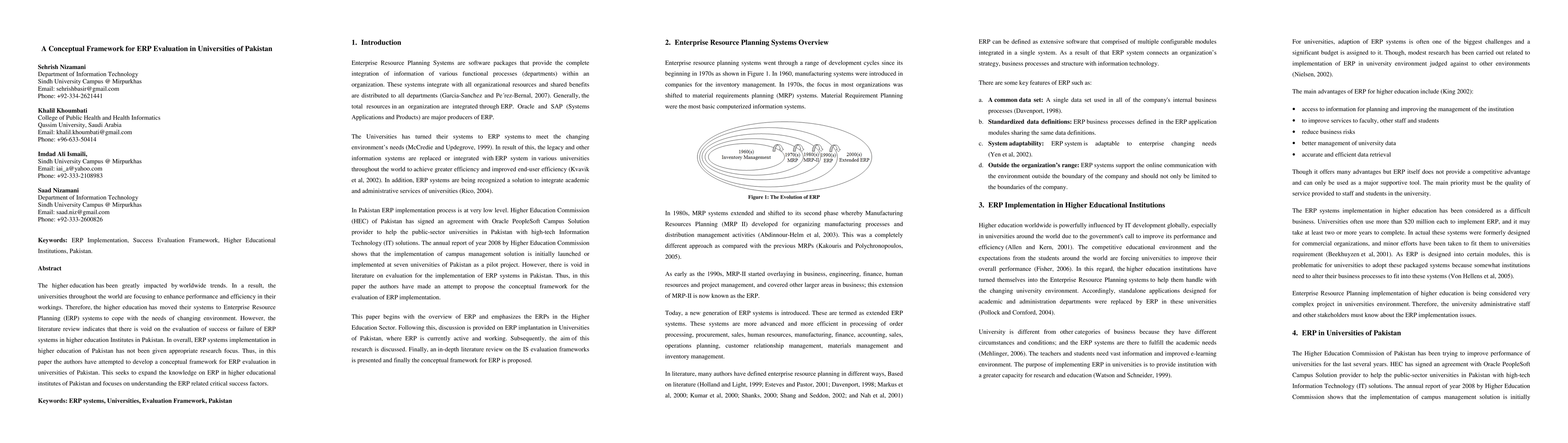 This paper develops a conceptual framework for evaluating ERP systems in Pakistani universities, addressing the lack of research on ERP success factors in higher education institutions in Pakistan and aiming to enhance understanding of critical success factors for ERP implementation.