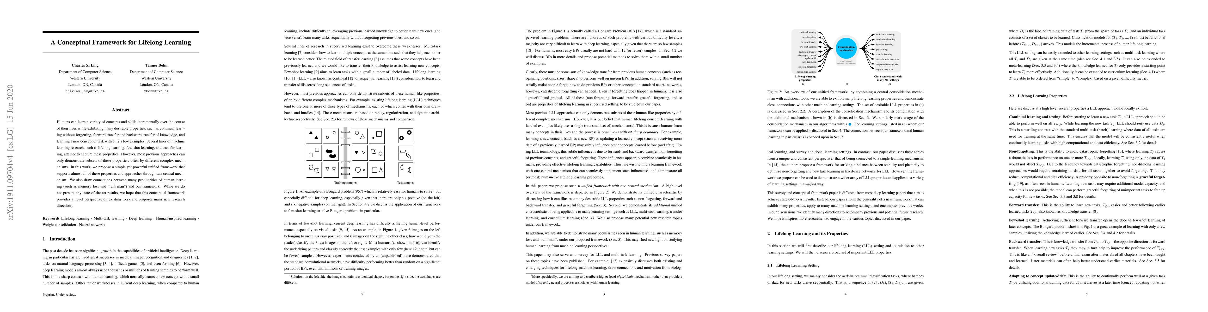 This paper proposes a unified conceptual framework for lifelong learning in machine learning that aims to encapsulate various desirable learning properties, such as continual learning without forgetting and transfer of knowledge. The framework offers a simple mechanism to support these properties and draws parallels to human learning phenomena.
