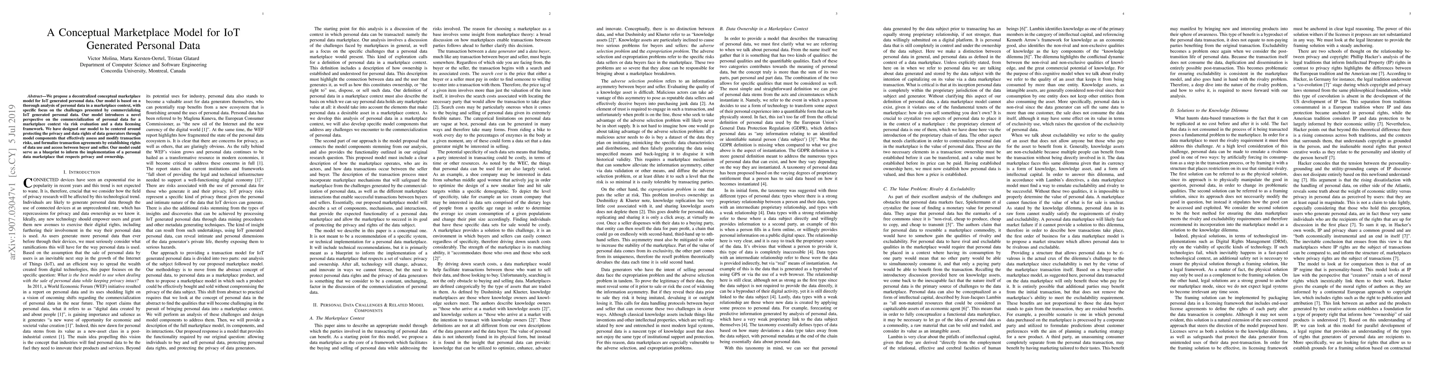 This paper proposes a decentralized marketplace model for IoT-generated personal data, focusing on privacy protection and data rights. It introduces a risk evaluation and data licensing framework to facilitate secure commercialization while respecting data generators' rights.