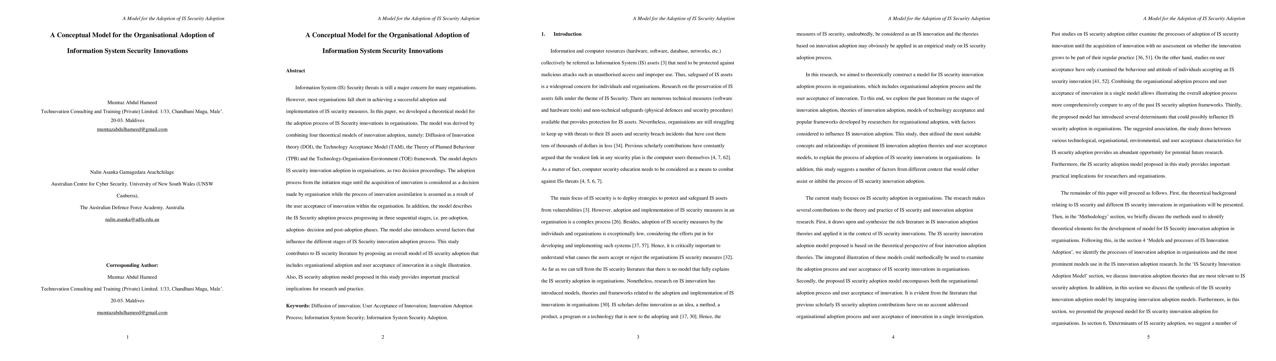 Information System (IS) Security threats is still a major concern for many organisations. However, most organisations fall short in achieving a successful adoption and implementation of IS security measures. In this paper, we developed a theoretical model for the adoption process of IS Security innovations in organisations. The model was derived by combining four theoretical models of innovation adoption, namely: Diffusion of Innovation theory (DOI), the Technology Acceptance Model (TAM), the Theory of Planned Behaviour (TPB) and the Technology-Organisation-Environment (TOE) framework. The model depicts IS security innovation adoption in organisations, as two decision proceedings. The adoption process from the initiation stage until the acquisition of innovation is considered as a decision made by organisation while the process of innovation assimilation is assumed as a result of the user acceptance of innovation within the organisation. In addition, the model describes the IS Security adoption process progressing in three sequential stages, i.e. pre-adoption, adoption- decision and post-adoption phases. The model also introduces several factors that influence the different stages of IS Security innovation adoption process. This study contributes to IS security literature by proposing an overall model of IS security adoption that includes organisational adoption and user acceptance of innovation in a single illustration. Also, IS security adoption model proposed in this study provides important practical implications for research and practice.