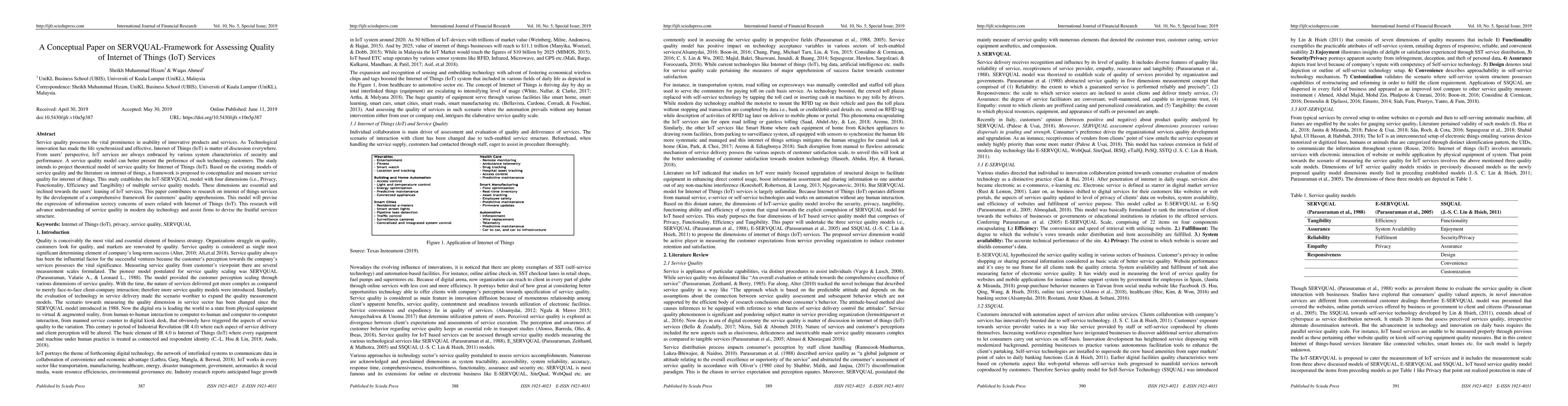 This paper proposes a SERVQUAL-based framework to assess the quality of Internet of Things (IoT) services, incorporating dimensions of Privacy, Functionality, Efficiency, and Tangibility. The developed IoT-Servqual model aims to enhance understanding of service quality in modern technology and assist firms in creating effective service structures.