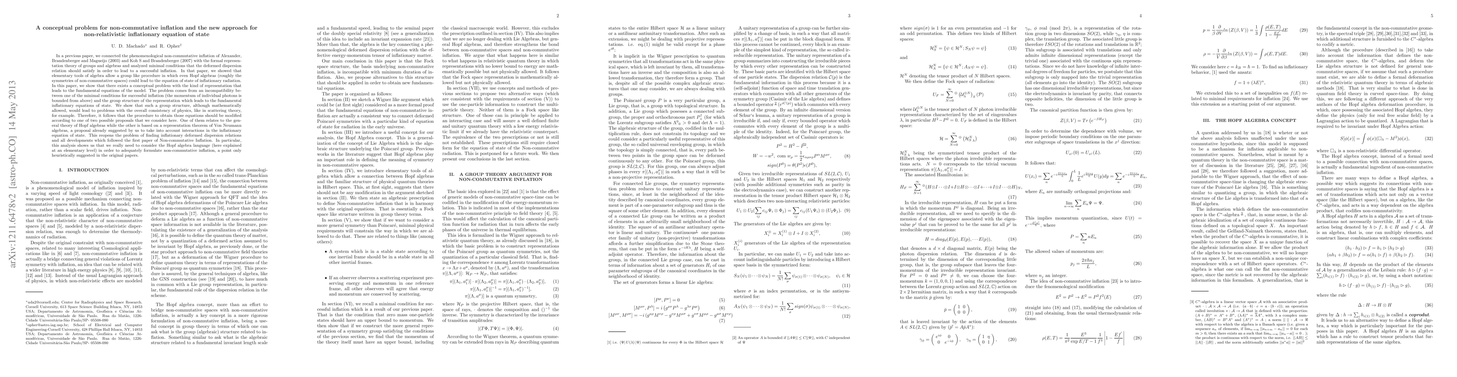 In a previous paper, we connected the phenomenological non-commutative inflation of Alexander, Brandenberger and Magueijo (2003) and Koh S and Brandenberger (2007) with the formal representation theory of groups and algebras and analyzed minimal conditions that the deformed dispersion relation should satisfy in order to lead to a successful inflation. In that paper, we showed that elementary tools of algebra allow a group like procedure in which even Hopf algebras (roughly the symmetries of non-commutative spaces) could lead to the equation of state of inflationary radiation. In this paper, we show that there exists a conceptual problem with the kind of representation that leads to the fundamental equations of the model. The problem comes from an incompatibility between one of the minimal conditions for successful inflation (the momentum of individual photons is bounded from above) and the group structure of the representation which leads to the fundamental inflationary equations of state. We show that such a group structure, although mathematically allowed, would lead to problems with the overall consistency of physics, like in scattering theory, for example. Therefore, it follows that the procedure to obtain those equations should be modified according to one of two possible proposals that we consider here. One of them relates to the general theory of Hopf algebras while the other is based on a representation theorem of Von Neumann algebras, a proposal already suggested by us to take into account interactions in the inflationary equation of state. This reopens the problem of finding inflationary deformed dispersion relations and all developments which followed the first paper of Non-commutative Inflation.