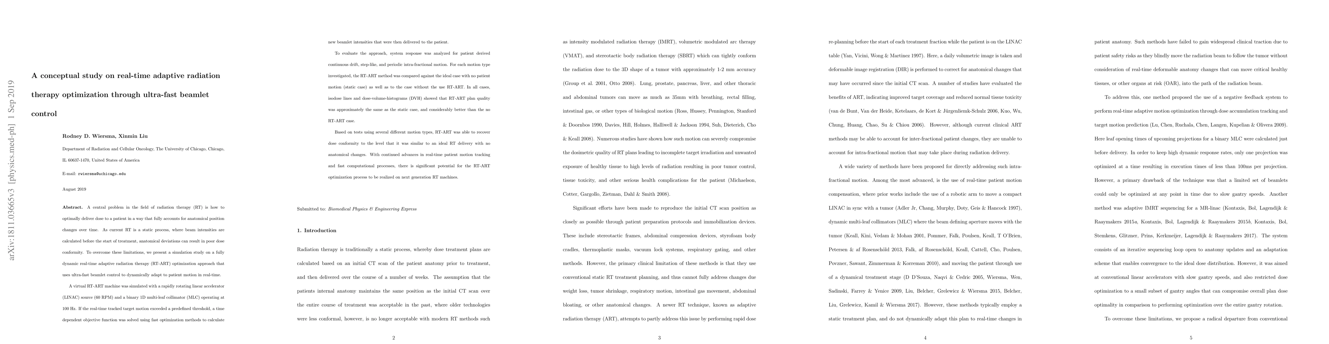 This study explores a real-time adaptive radiation therapy (RT-ART) optimization method using ultra-fast beamlet control to dynamically adjust to patient motion during treatment. The proposed RT-ART system showed comparable plan quality to static cases and significantly improved outcomes over traditional methods, indicating potential for future implementation in advanced radiation therapy machines.