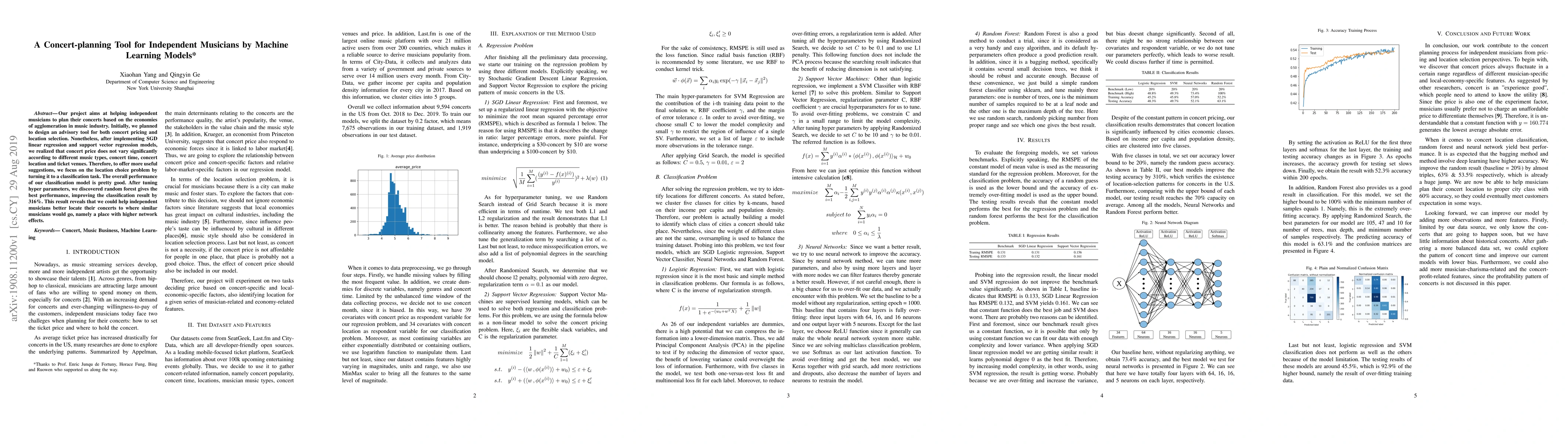Our project aims at helping independent musicians to plan their concerts based on the economies of agglomeration in the music industry. Initially, we planned to design an advisory tool for both concert pricing and location selection. Nonetheless, after implementing SGD linear regression and support vector regression models, we realized that concert price does not vary significantly according to different music types, concert time, concert location and ticket venues. Therefore, to offer more useful suggestions, we focus on the location choice problem by turning it to a classification task. The overall performance of our classification model is pretty good. After tuning hyperparameters, we discovered the Random Forest gives the best performance, improving the classification result by 316%. This result reveals that we could help independent musicians better locate their concerts to where similar musicians would go, namely a place with higher network effects.