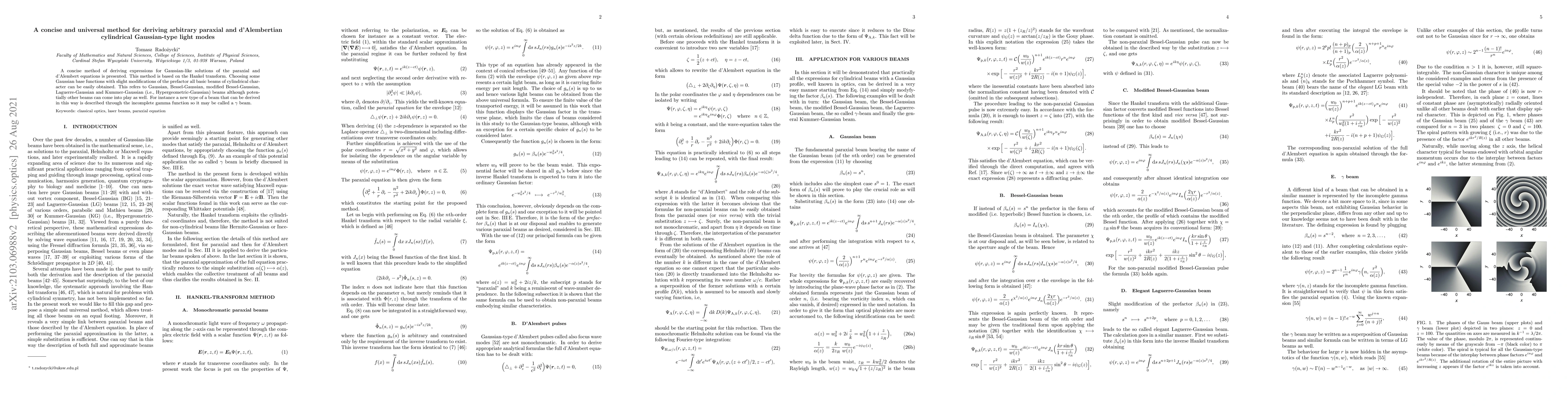 A concise method of deriving expressions for Gaussian-like solutions of the paraxial and d'Alembert equations is presented. This method is based on the Hankel transform. Choosing some Gaussian base functions with slight modifications of the prefactor all basic beams of cylindrical character can be easily obtained. This refers to Gaussian, Bessel-Gaussian, modified Bessel-Gaussian, Laguerre-Gaussian and Kummer-Gaussian (i.e., Hypergeometric-Gaussian) beams although potentially other beams can come into play as well. For instance a new type of a beam that can be derived in this way is described through the incomplete gamma function so it may be called a $\gamma$ beam.