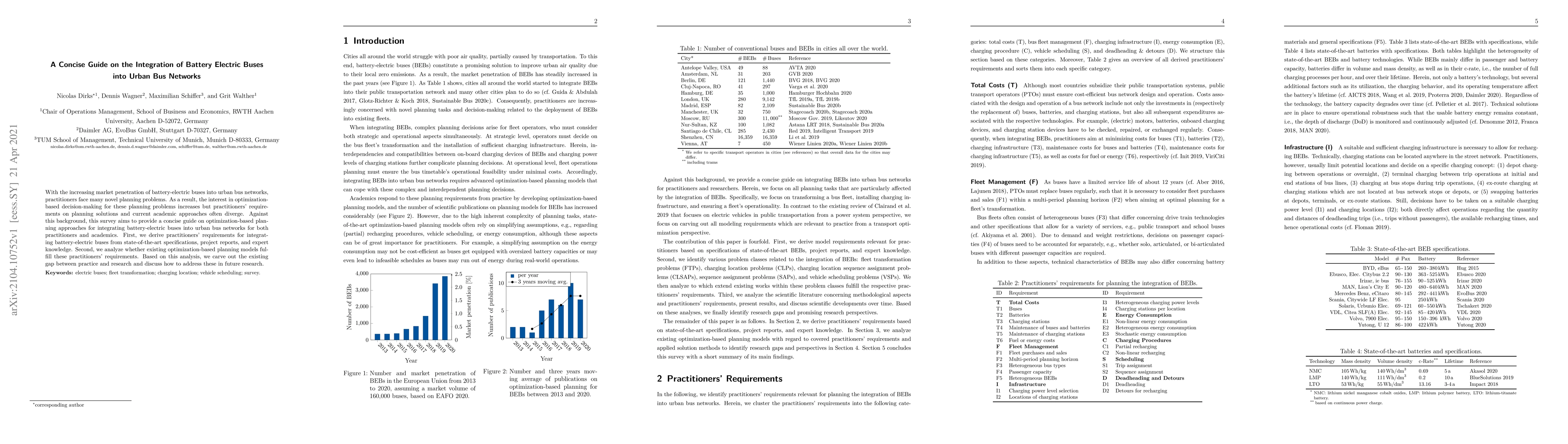 With the increasing market penetration of battery-electric buses into urban bus networks, practitioners face many novel planning problems. As a result, the interest in optimization-based decision-making for these planning problems increases but practitioners' requirements on planning solutions and current academic approaches often diverge. Against this background, this survey aims to provide a concise guide on optimization-based planning approaches for integrating battery-electric buses into urban bus networks for both practitioners and academics. First, we derive practitioners' requirements for integrating battery-electric buses from state-of-the-art specifications, project reports, and expert knowledge. Second, we analyze whether existing optimization-based planning models fulfill these practitioners' requirements. Based on this analysis, we carve out the existing gap between practice and research and discuss how to address these in future research.