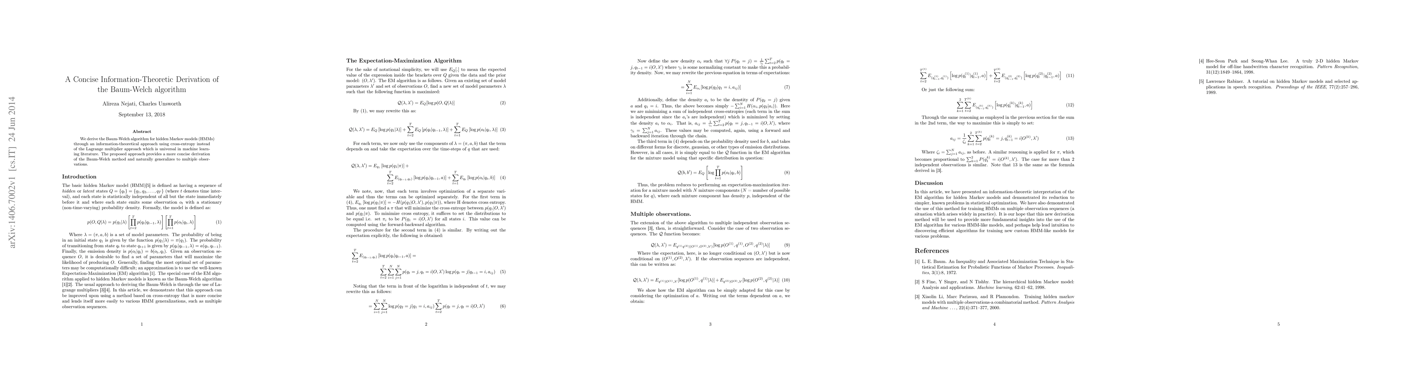 This paper presents an information-theoretic derivation of the Baum-Welch algorithm for hidden Markov models using cross-entropy, offering a more concise approach compared to traditional Lagrange multiplier methods and extending naturally to multiple observations.