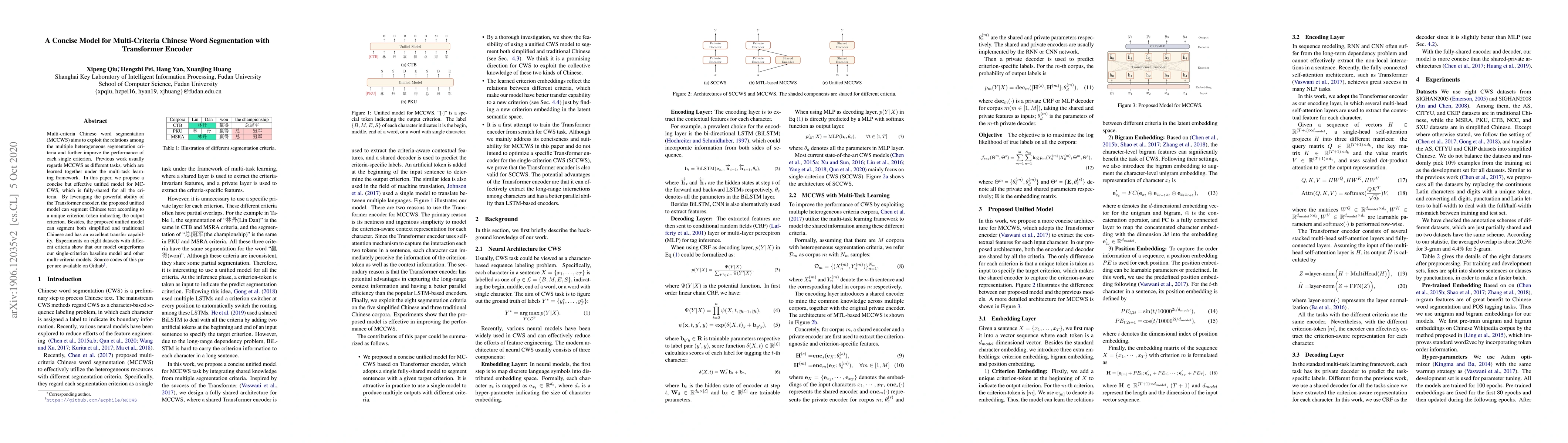 This paper proposes a unified Transformer encoder model for multi-criteria Chinese word segmentation, which effectively integrates various segmentation criteria into a single framework. The model demonstrates superior performance across multiple datasets and shows strong transferability between simplified and traditional Chinese.