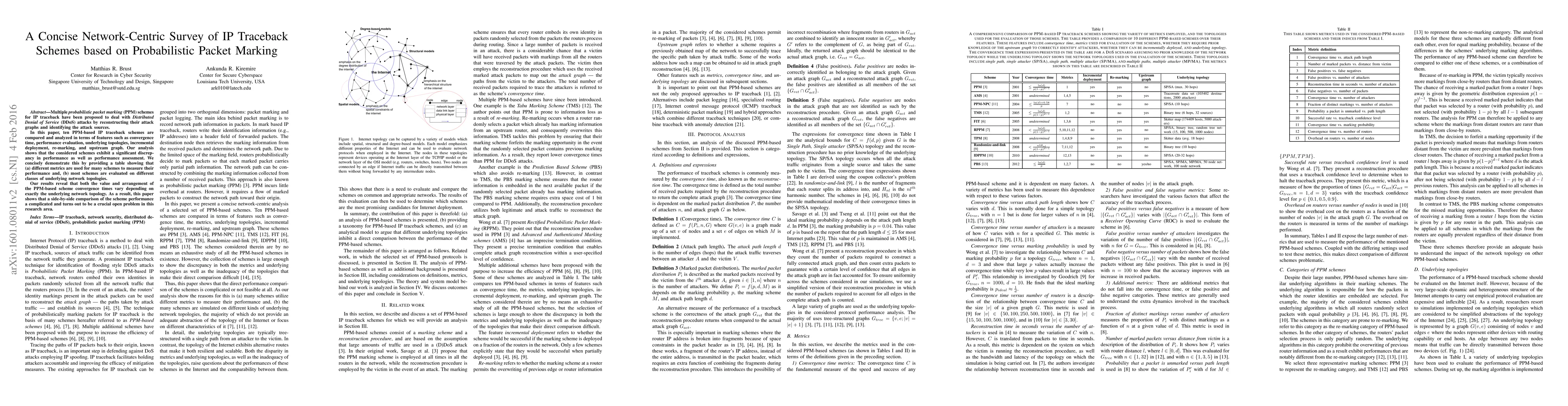 This paper surveys ten probabilistic packet marking (PPM) schemes for IP traceback, comparing their performance across various metrics and network topologies. It highlights significant discrepancies in performance assessment and convergence times, emphasizing the complexity of direct scheme comparisons.