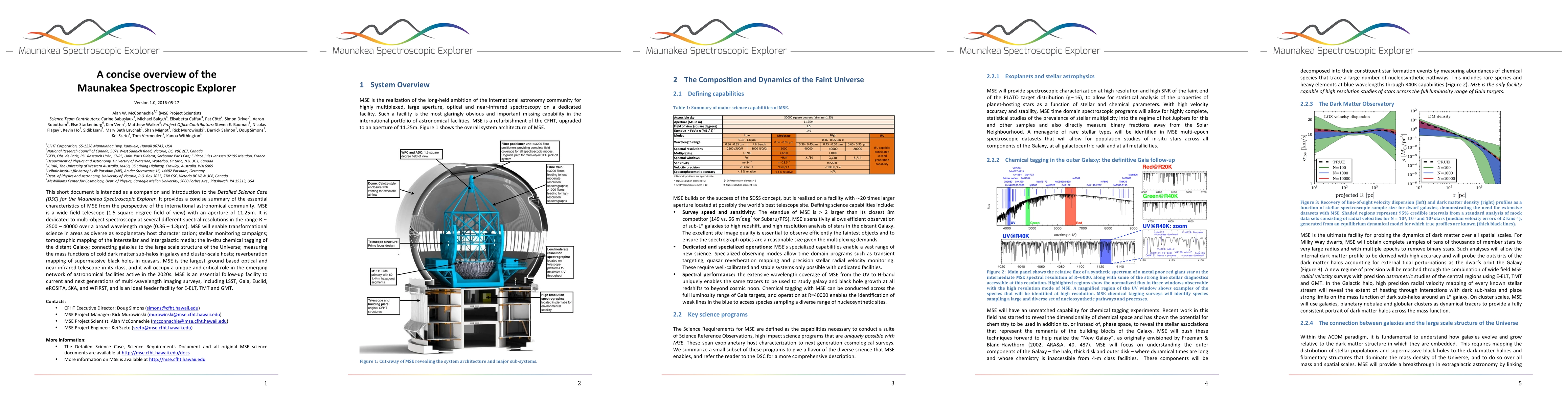 This short document is intended as a companion and introduction to the Detailed Science Case (DSC) for the Maunakea Spectroscopic Explorer. It provides a concise summary of the essential characteristics of MSE from the perspective of the international astronomical community. MSE is a wide field telescope (1.5 square degree field of view) with an aperture of 11.25m. It is dedicated to multi-object spectroscopy at several different spectral resolutions in the range R ~ 2500 - 40000 over a broad wavelength range (0.36 - 1.8{\mu}m). MSE will enable transformational science in areas as diverse as exoplanetary host characterization; stellar monitoring campaigns; tomographic mapping of the interstellar and intergalactic media; the in-situ chemical tagging of the distant Galaxy; connecting galaxies to the large scale structure of the Universe; measuring the mass functions of cold dark matter sub-halos in galaxy and cluster-scale hosts; reverberation mapping of supermassive black holes in quasars. MSE is the largest ground based optical and near infrared telescope in its class, and it will occupy a unique and critical role in the emerging network of astronomical facilities active in the 2020s. MSE is an essential follow-up facility to current and next generations of multi-wavelength imaging surveys, including LSST, Gaia, Euclid, eROSITA, SKA, and WFIRST, and is an ideal feeder facility for E-ELT, TMT and GMT.