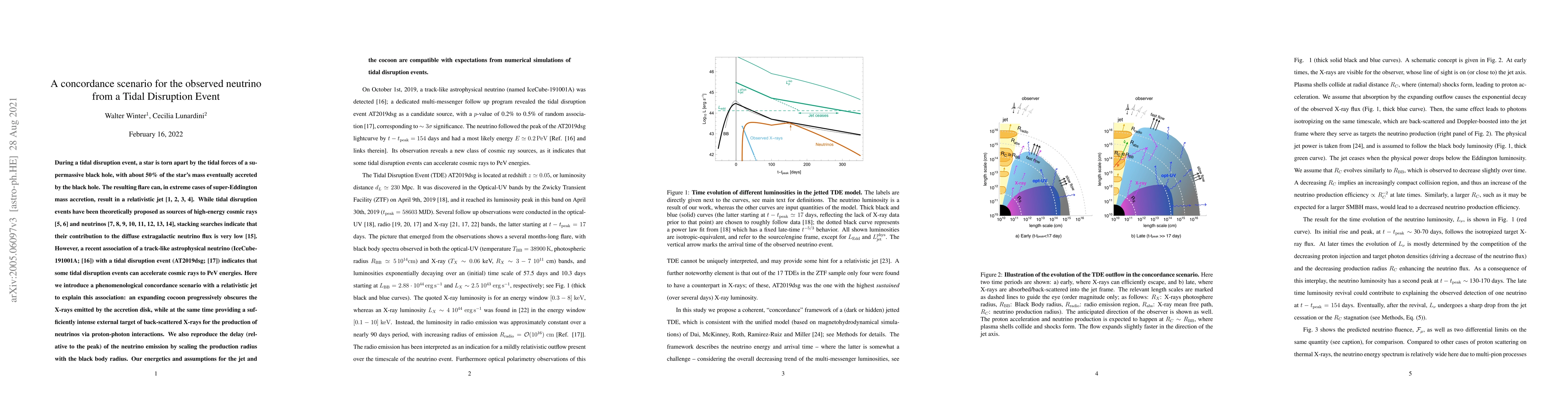 This paper proposes a concordance scenario explaining the association of a high-energy astrophysical neutrino with a tidal disruption event, suggesting a relativistic jet and an expanding cocoon that provide the necessary conditions for neutrino production via proton-photon interactions. The model aligns with the observed delay in neutrino emission and is consistent with numerical simulations of such events.