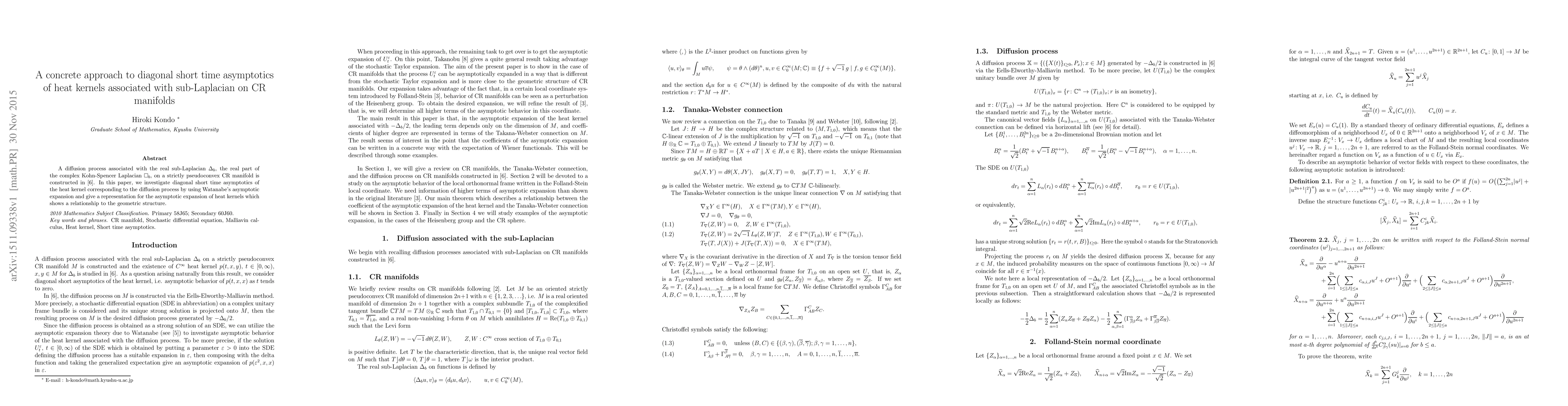 This paper constructs a diffusion process using the real sub-Laplacian on a strictly pseudoconvex CR manifold and investigates its heat kernel's diagonal short time asymptotics. It employs Watanabe's asymptotic expansion to derive a representation that reveals a connection to the manifold's geometric structure.