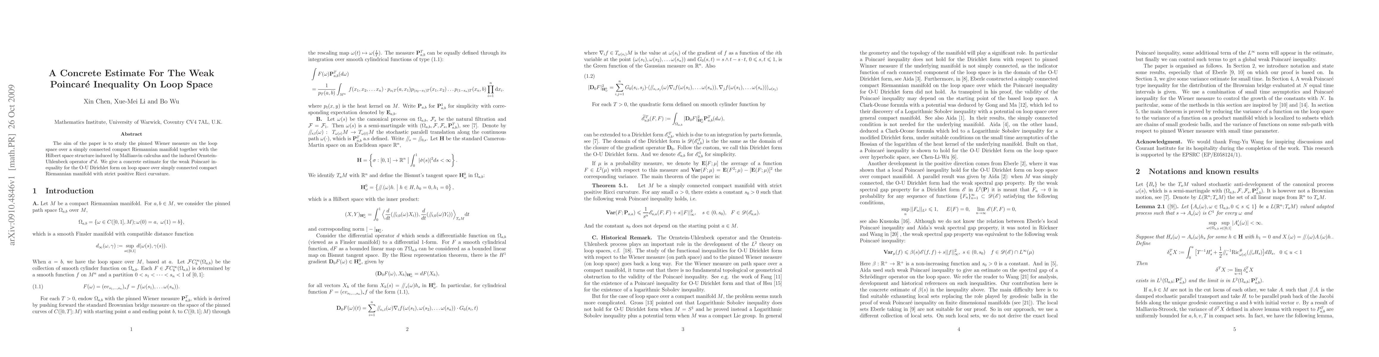 The aim of the paper is to study the pinned Wiener measure on the loop space over a simply connected compact Riemannian manifold together with the Hilbert space structure induced by Mallianvin calculus and the induced Ornstein- Uhlenbeck operator. We give a concrete estimate for the weak Poincare inequality for the O-U Dirichlet form on loop space over simply connected compact Riemannian manifold with strict positive Ricci curvature.