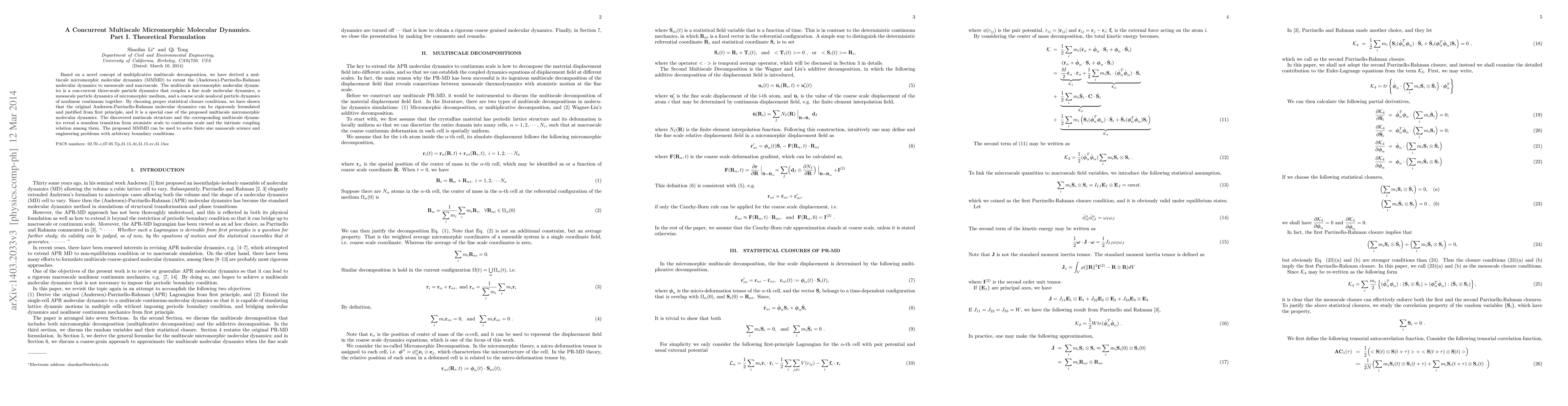 Based on a novel concept of multiplicative multiscale decomposition, we have derived a multiscale micromorphic molecular dynamics (MMMD)to extent the (Andersen)-Parrinello-Rahman molecular dynamics to mesoscale and macroscale. The multiscale micromorphic molecular dynamics is a con-current three-scale particle dynamics that couples a fine scale molecular dynamics, a mesoscale particle dynamics of micromorphic medium, and a coarse scale nonlocal particle dynamics of nonlinear continuum. By choosing proper statistical closure conditions, we have shown that the original Andersen-Parrinello-Rahman molecular dynamics can be rigorously formulated and justified from first principle, and it is a special case of the proposed multiscale micromorphic molecular dynamics. The discovered mutiscale structure and the corresponding multiscale dynamics reveal a seamless transition channel from atomistic scale to continuum scale and the intrinsic coupling relation among them, and it can be used to solve finite size nanoscale science and engineering problems with arbitrary boundary conditions.