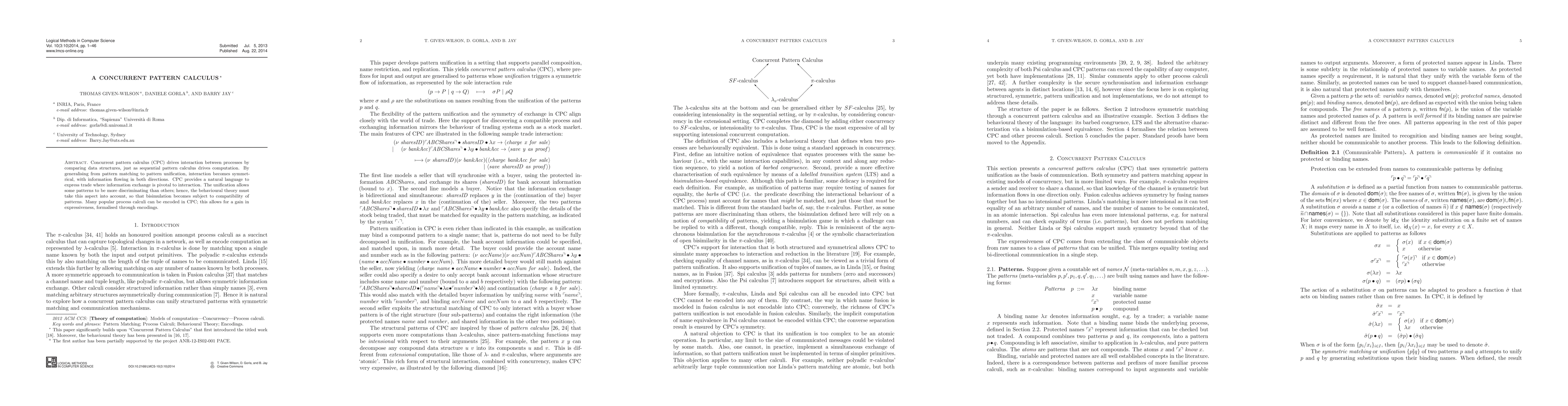 Concurrent pattern calculus (CPC) drives interaction between processes by comparing data structures, just as sequential pattern calculus drives computation. By generalising from pattern matching to pattern unification, interaction becomes symmetrical, with information flowing in both directions. CPC provides a natural language to express trade where information exchange is pivotal to interaction. The unification allows some patterns to be more discriminating than others; hence, the behavioural theory must take this aspect into account, so that bisimulation becomes subject to compatibility of patterns. Many popular process calculi can be encoded in CPC; this allows for a gain in expressiveness, formalised through encodings.
