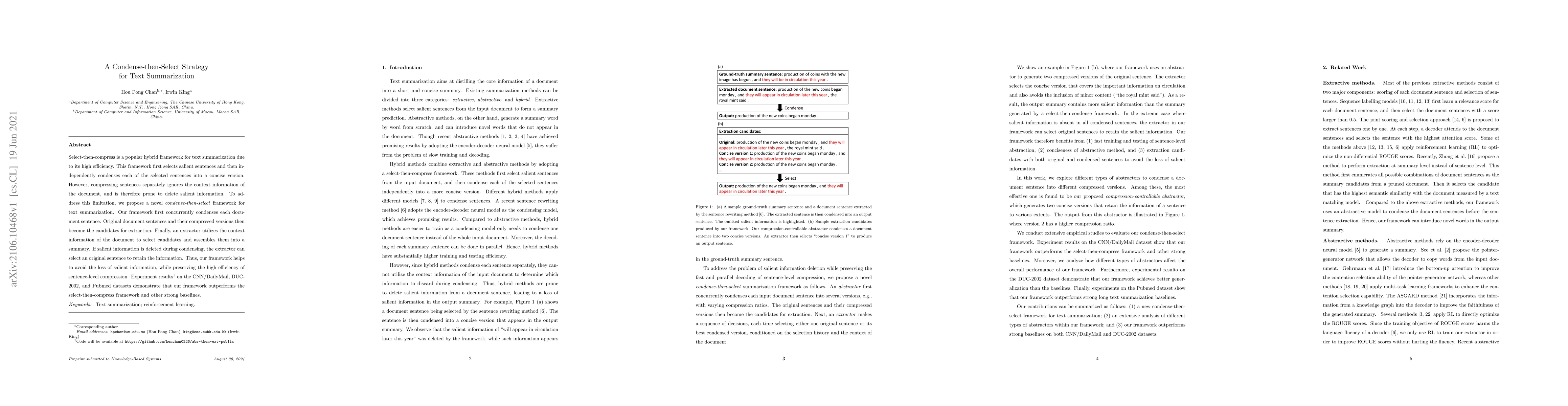 Select-then-compress is a popular hybrid, framework for text summarization due to its high efficiency. This framework first selects salient sentences and then independently condenses each of the selected sentences into a concise version. However, compressing sentences separately ignores the context information of the document, and is therefore prone to delete salient information. To address this limitation, we propose a novel condense-then-select framework for text summarization. Our framework first concurrently condenses each document sentence. Original document sentences and their compressed versions then become the candidates for extraction. Finally, an extractor utilizes the context information of the document to select candidates and assembles them into a summary. If salient information is deleted during condensing, the extractor can select an original sentence to retain the information. Thus, our framework helps to avoid the loss of salient information, while preserving the high efficiency of sentence-level compression. Experiment results on the CNN/DailyMail, DUC-2002, and Pubmed datasets demonstrate that our framework outperforms the select-then-compress framework and other strong baselines.